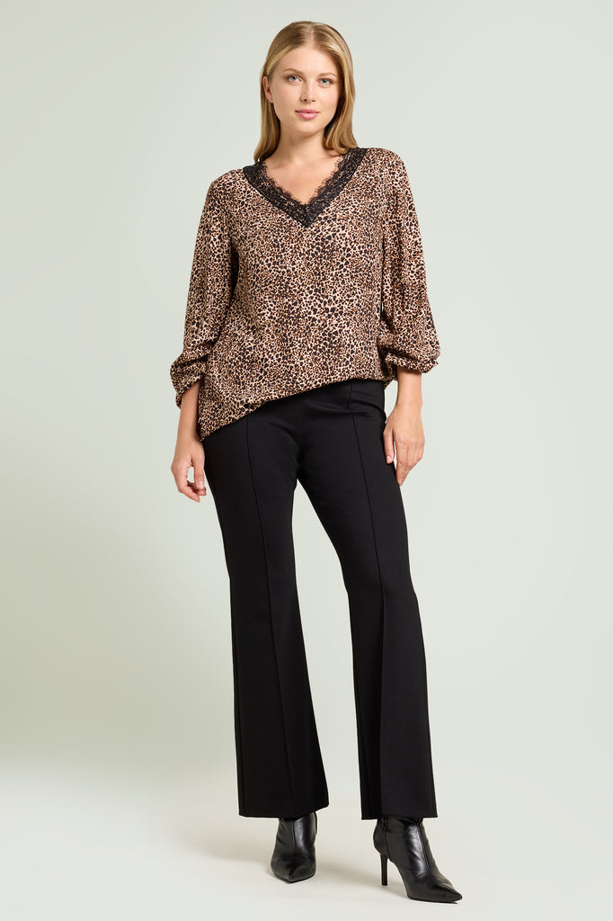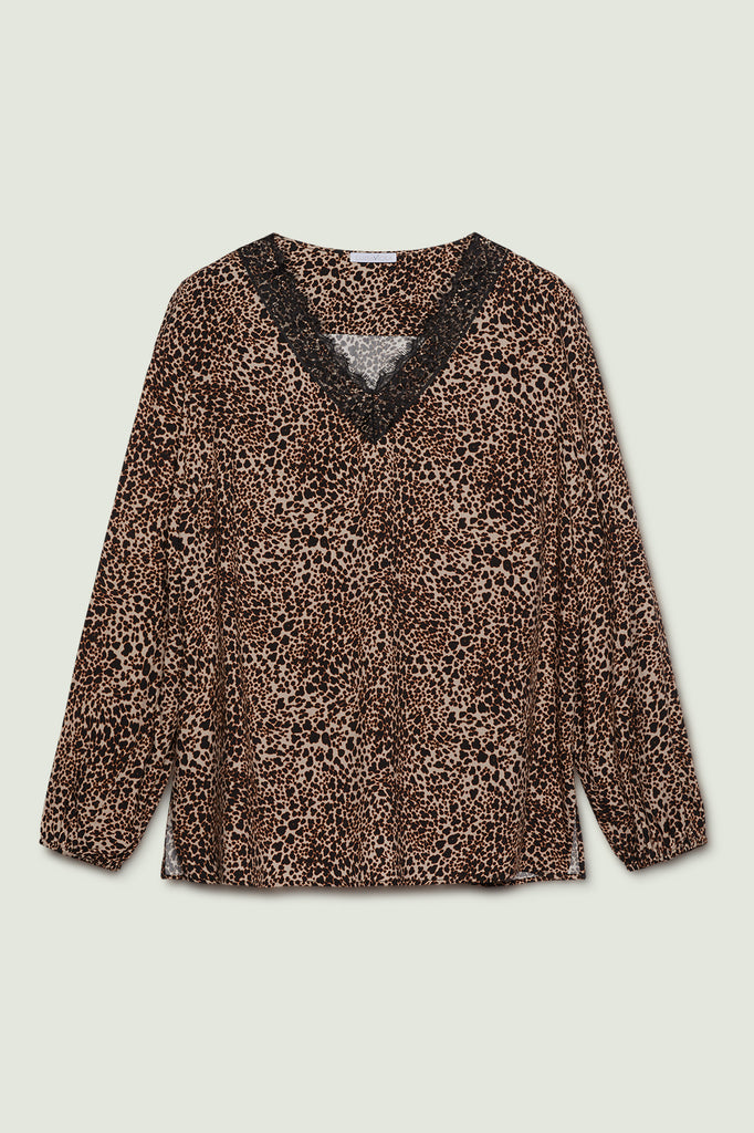 Blusa fantasia in giavanese di viscosa dalla linea dritta con spacchi laterali. Scollo a V con passamaneria in pizzo, maniche lunghe con polso a sbuffo.