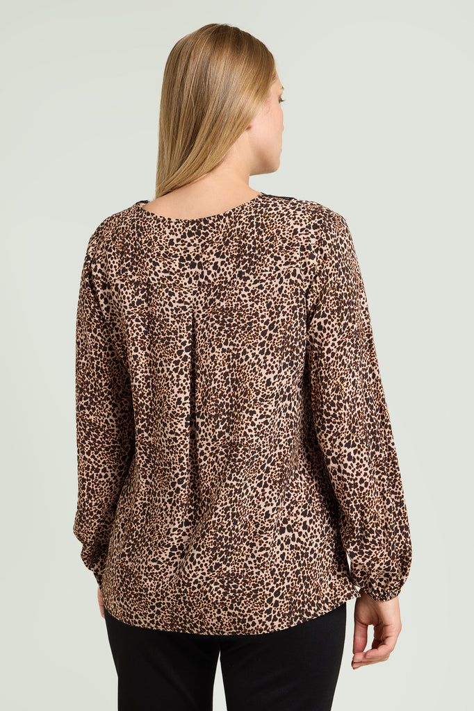 Il maculato -trend di stagione- viene reinterpretato in modo femminile con un armonico movimento grafico, dove il nero ed il mocha mousse si sposano ad un delicato beige rosato. Una stampa esclusiva Luisa Viola.