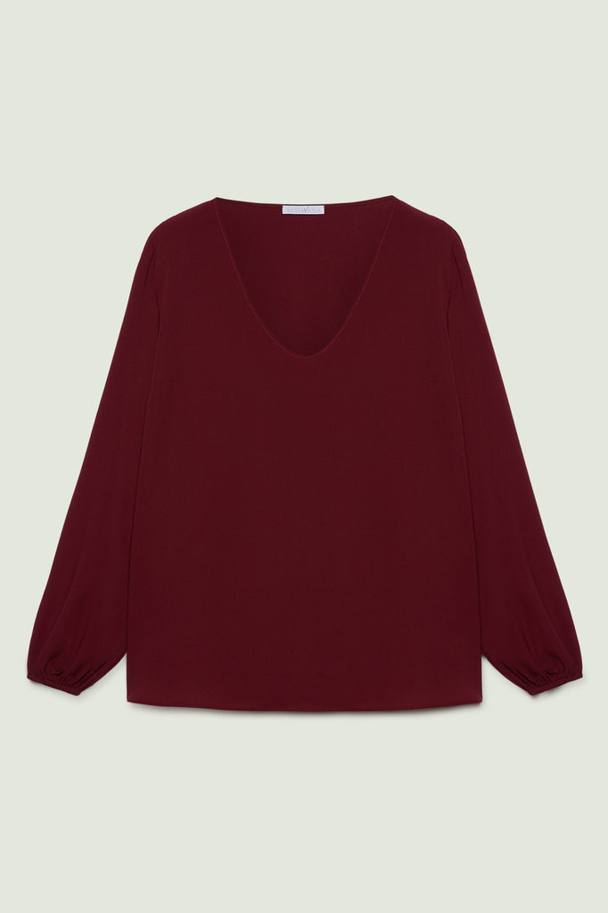 Blusa in cloque' caratterizzata da un femminile scollo a "V", linea dritta con spacchetti stondati, manche a sbuffo.