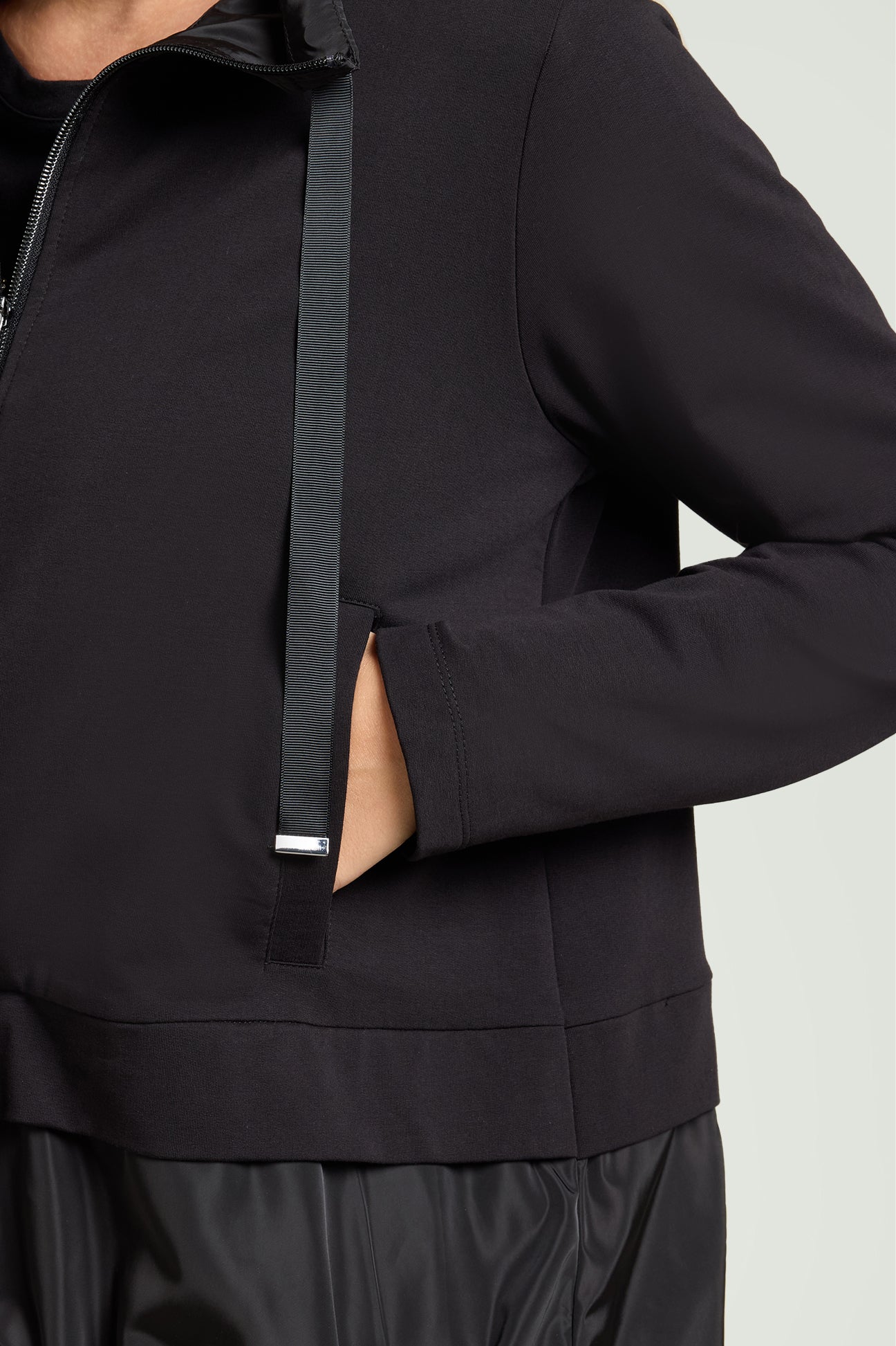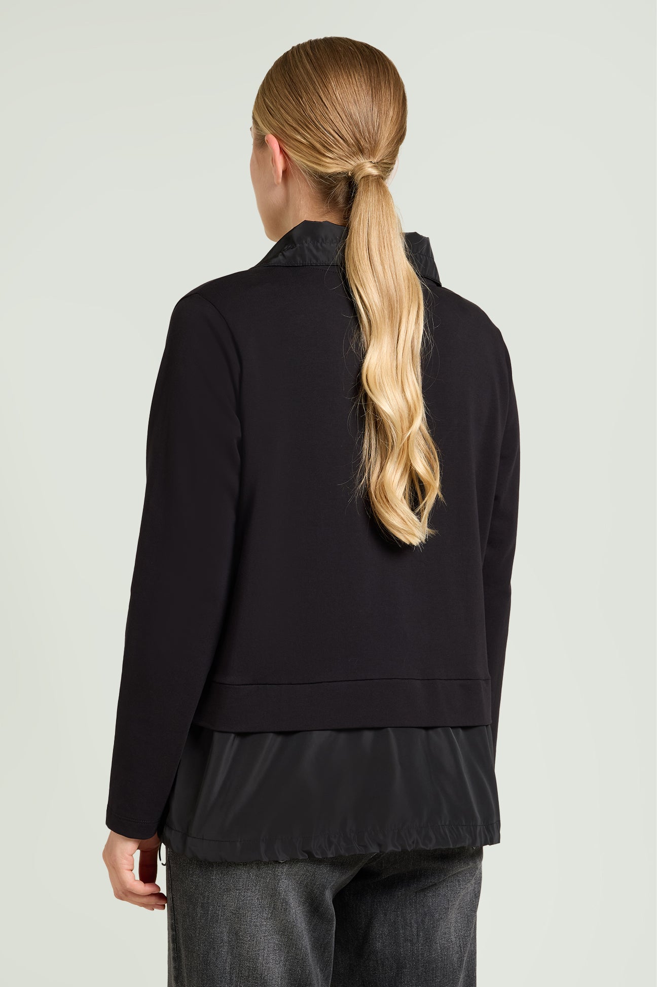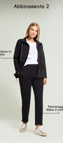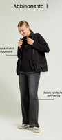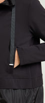 Caban in felpa leggera di cotone stretch con parti in nylon. Chiusura con zip, collo con coulisse, nastro in Gros Grain con puntali in metallo, tasche a filetto. Tiretto con finitura gunmetal, personalizzato con il logo "V" di Luisa Viola. Abbinabile a pantaloni Jogger nello stesso tessuto per creare un completo coordinato.