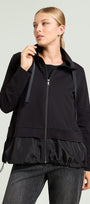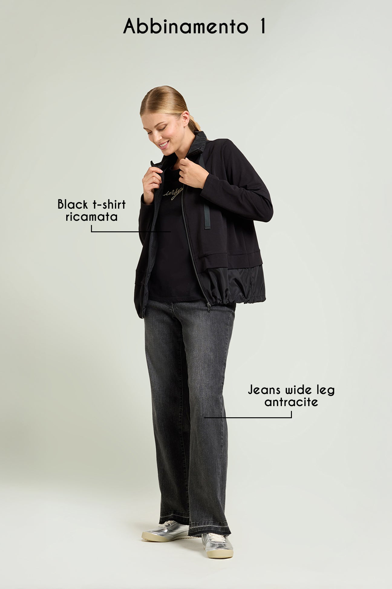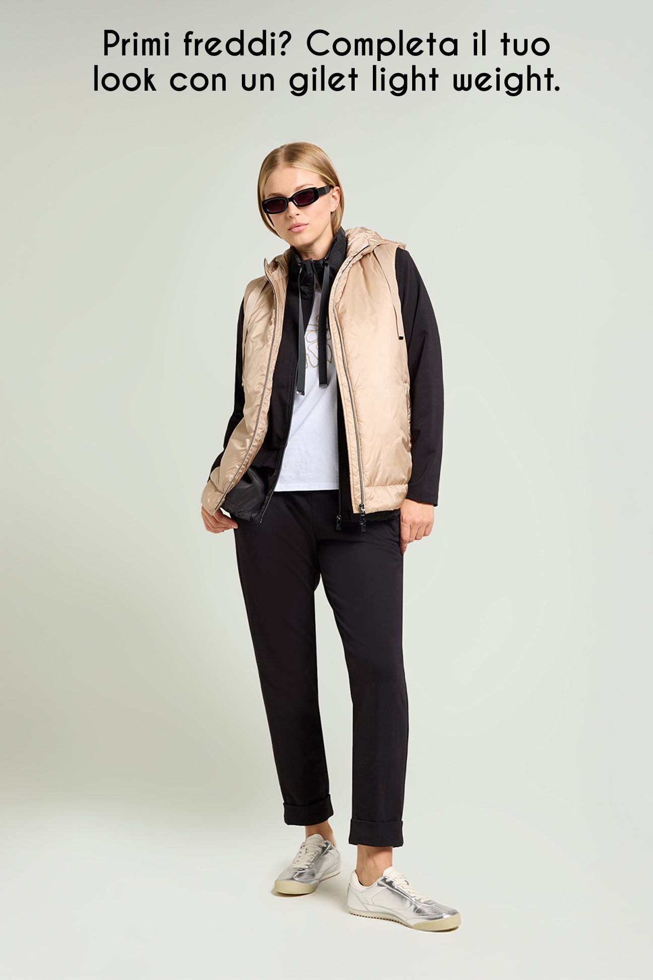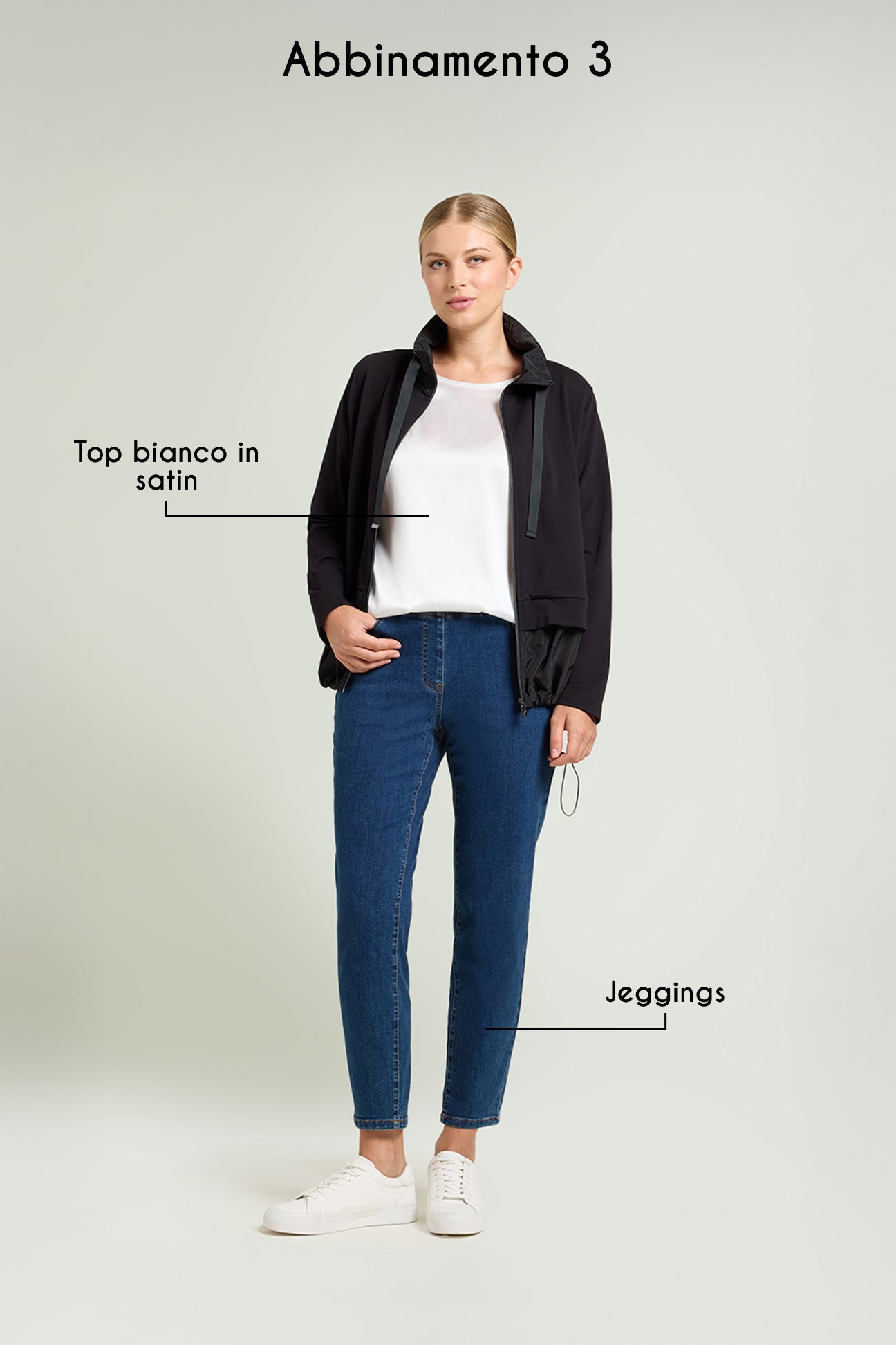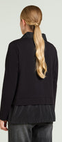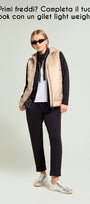 I due tessuti creano un moderno effetto "layering" e grazie alla coulisse regolabile sul fondo è possibile modificare la linea, da svasata a remboursé.