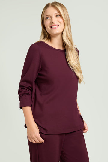 Felpa dalla linea dritta con scollo a barchetta e spacchi stondati realizzata in un morbido Punto Milano elasticizzato. Abbinabile anche a completo con pantaloni nello stesso tessuto.