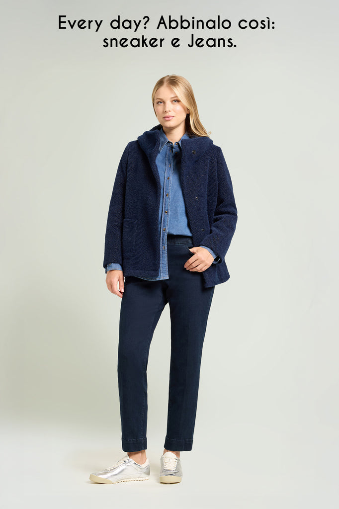 Morbido giaccone realizzato in un tessuto speciale: un'armatura chevron illuminata dall'intervento di un filo lurex che dona al capo un aspetto prezioso. Linea dritta, collo a corolla, chiusura con bottoni automatici nascosti, tasche applicate, foderato.