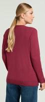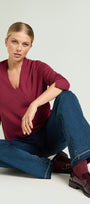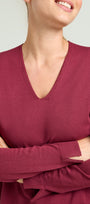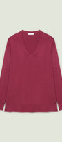 Maglia in viscosa comfort dalla linea leggermente sciancrata nel nuovo color cherry. Punto rasato in finezza 12 con bordi in costa. Scollo a "V" con calature, dettagli con filato lurex tono su tono, spacchetti laterali e su fondo manica.
