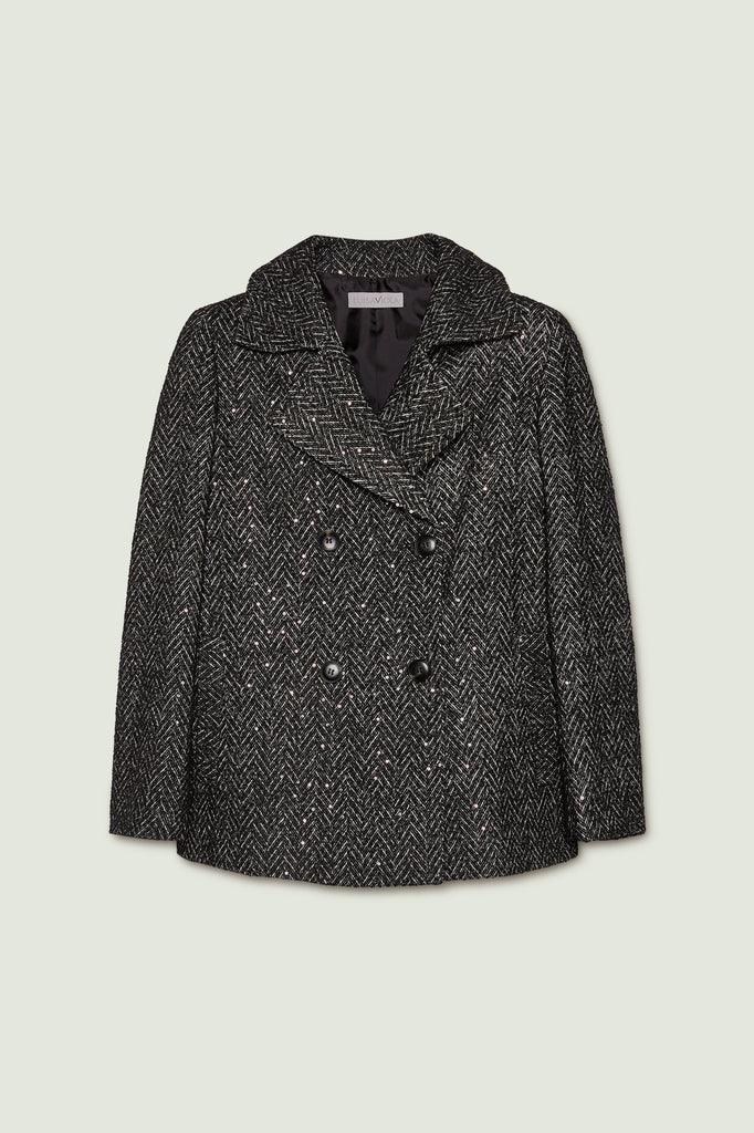 Giaccone doppiopetto realizzato in un tessuto speciale: un chevron mouliné illuminato da una pioggia di piccole paillettes. Linea dritta, collo e rever, chiusura con asole e bottoni, tasche inclinate, foderato.