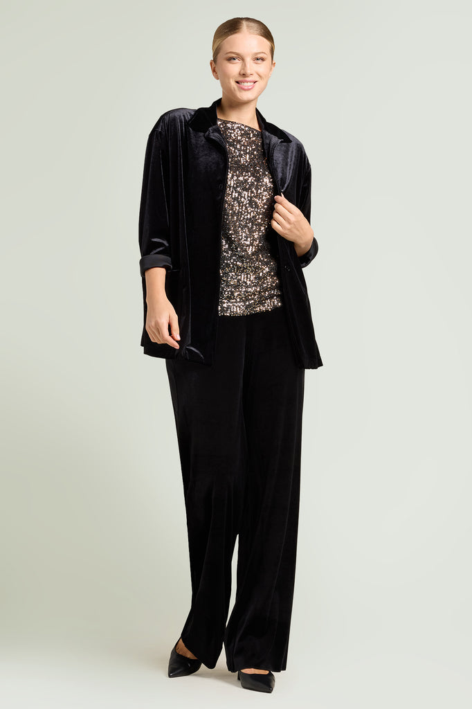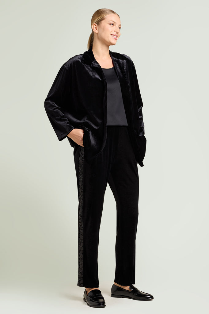 Come insegna la tradizione sartoriale, il capo è tagliato con la direzione del velluto rivolta verso l'alto, in modo da ottenere un effetto uniforme del tessuto, un colore più intenso e un aspetto prezioso.