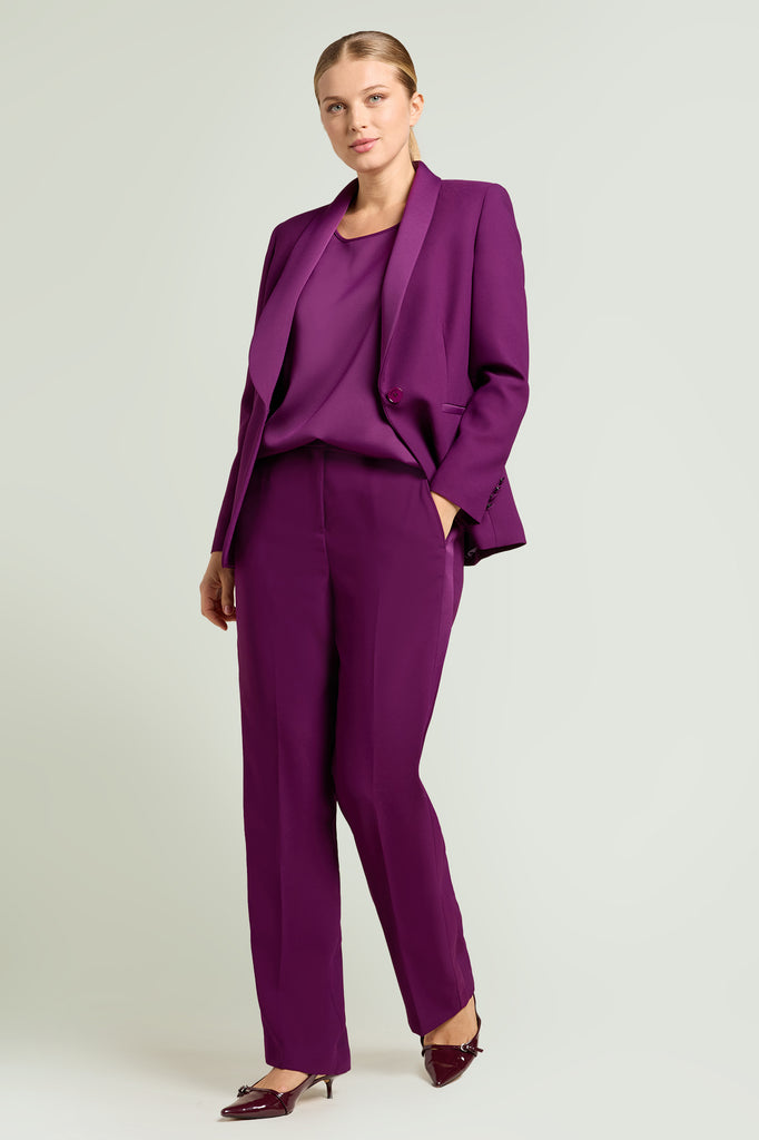 Disponibile in nero e nel nuovo color Porpora. Abbinabile anche a tailleur con pantaloni nello stesso tessuto.