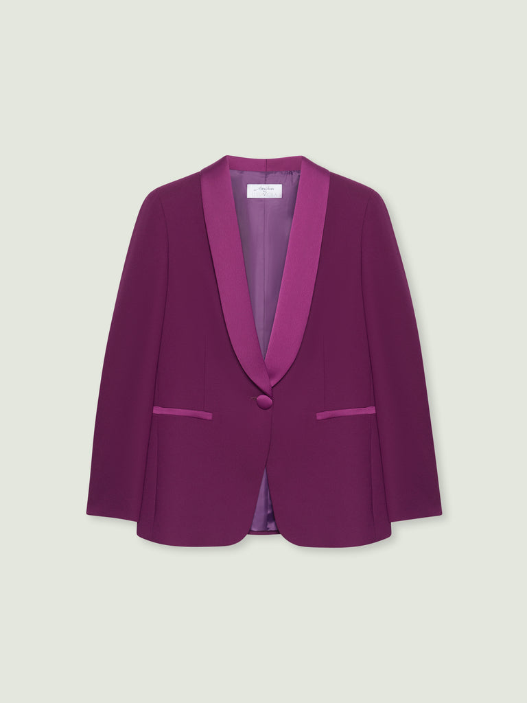 Giacca realizzata in tessuto crepe enver satin dalla linea leggermente sciancrata. Collo smoking in raso, chiusura con asola e bottone, fondo manica con quattro bottoni, tasche a filetto, bottoni in tessuto, foderata.