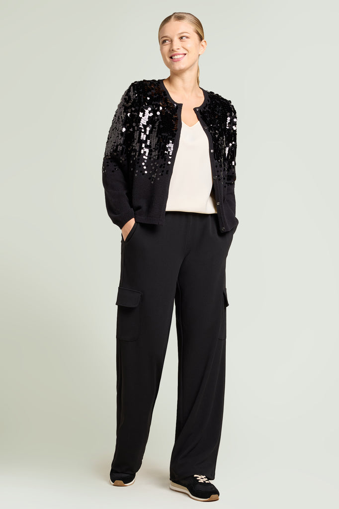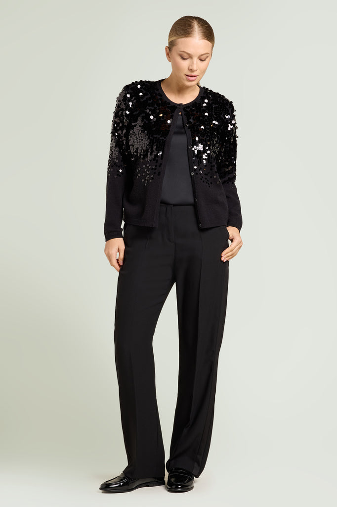 Giacca-cardigan collar ness realizzata in un confortevole filato winter touch. Punto rasato in finezza 7 con bordi in costa. Ricamata con maxi-paillettes in tinta.
