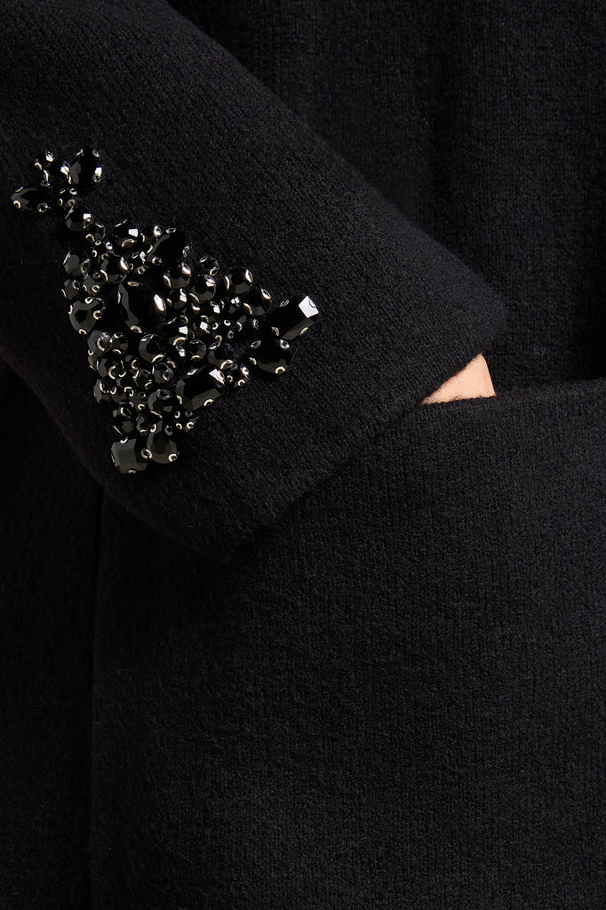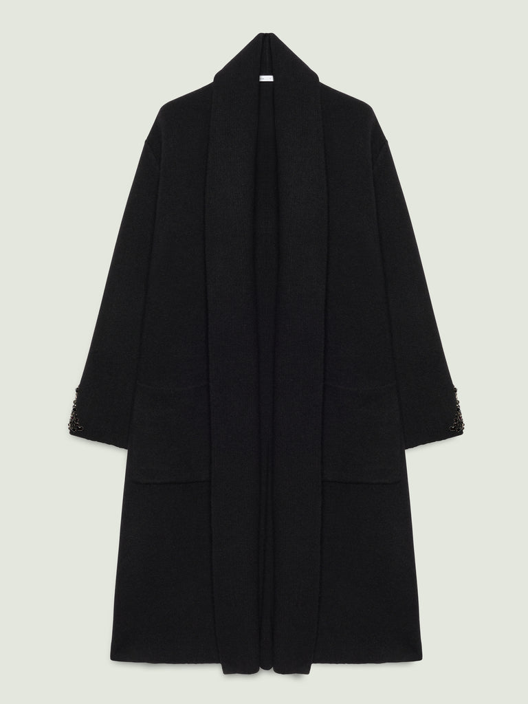 Cappotto in maglia dalla linea avvolgende con alti spacchi realizzato in un filato elasticizzato con effetto feltro. Collo sciallato, fondo manica impreziosito da un elaborato ricamo a mano di pietre e castoni.