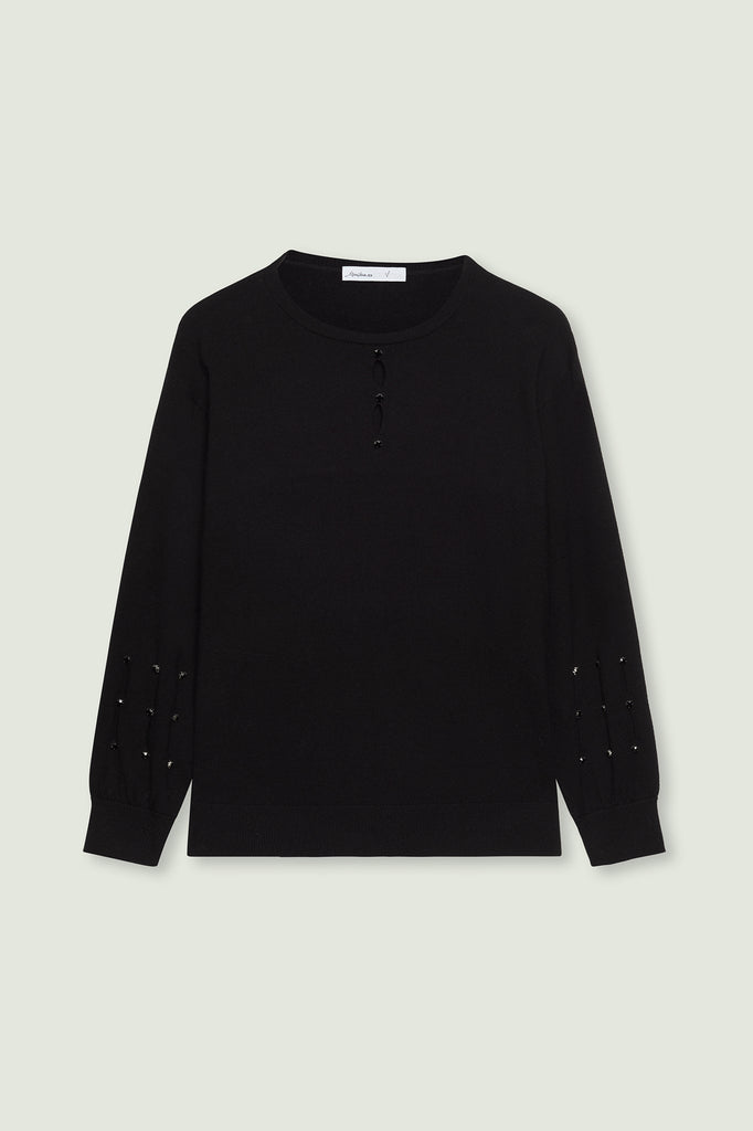 Maglia elegante in viscosa comfort winter touch, dalla linea comoda. Punto rasato in finezza 14 con bordi in costa, spacchi laterali. Maniche a sbuffo con motivi "cut out" e castoni in tinta applicati a mano.