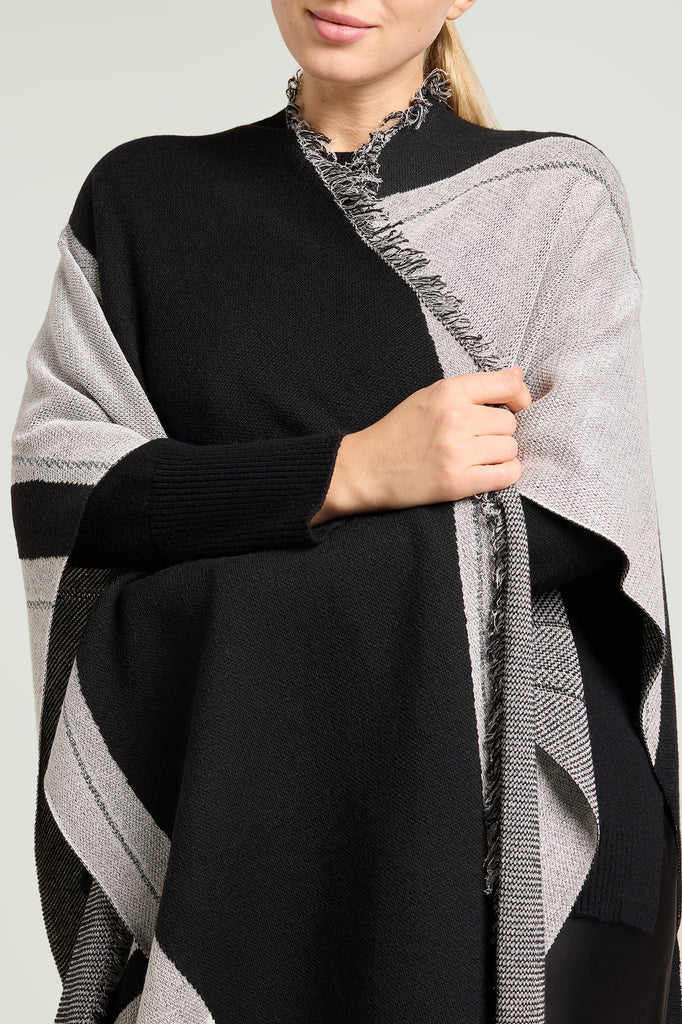 Mantella fantasia in tricot realizzata con tecnica piquet-jacquard: un elaborato disegno in finezza dodici ottenuto con tre fili di colore diverso ed un tocco di lurex.