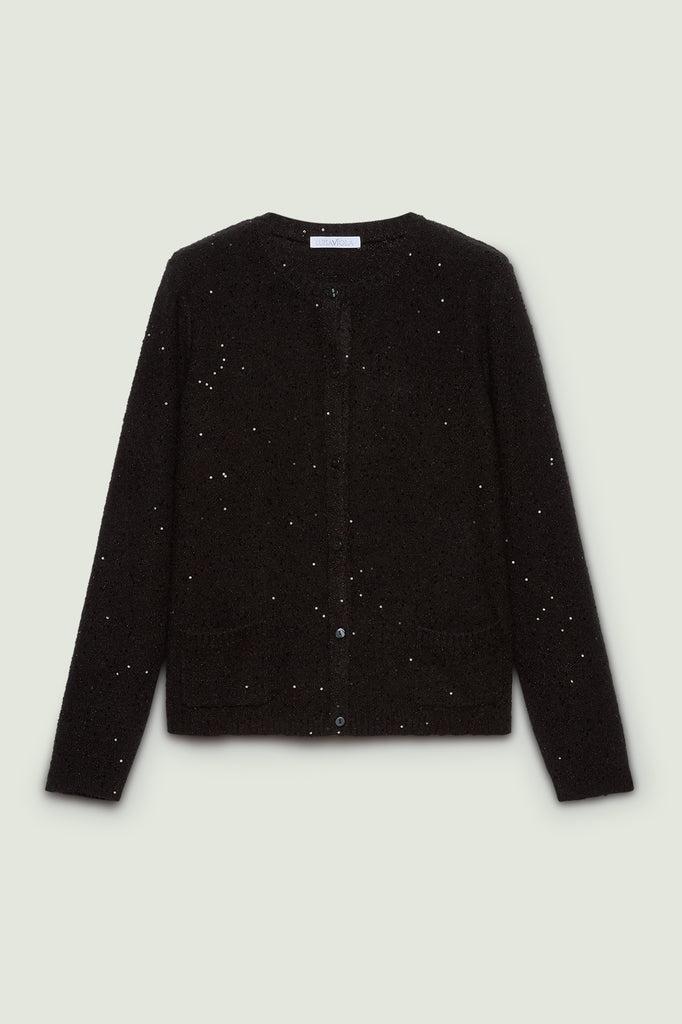 Cardigan-giacca soft touch dalla linea boxy in filato full-paillettes. Punto rovescio in finezza 7 con bordi in costa. Paricollo, chiusura con asole e bottoni, tasche applicate,