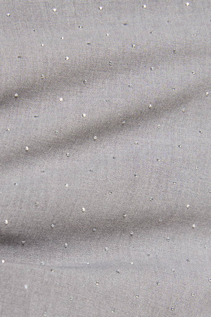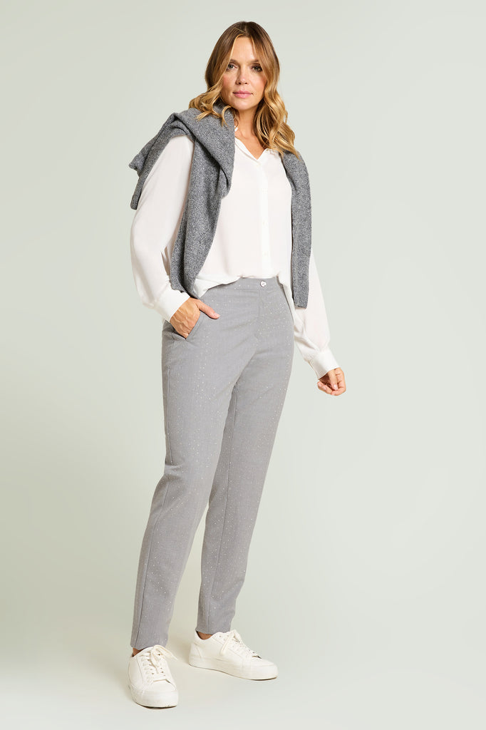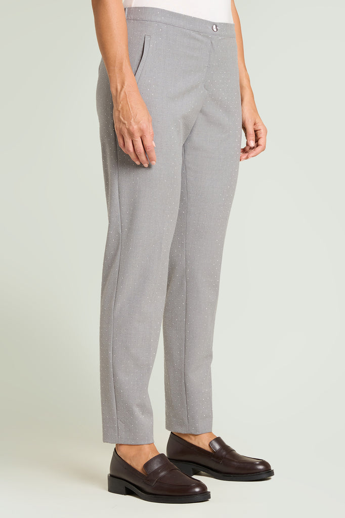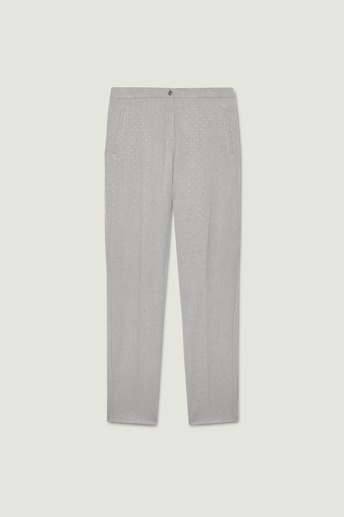 Pantaloni con fit sigaretta realizzato in un tessuto melange caratterizzato da una pioggia di micro borchiette sfaccettate. Tessuto stretch, punto vita regolare, chiusura davanti con zip nascosa e bottone, cintura estensibile con elastico inserito nel tratto dietro, tasche a filetto, piega stirata.