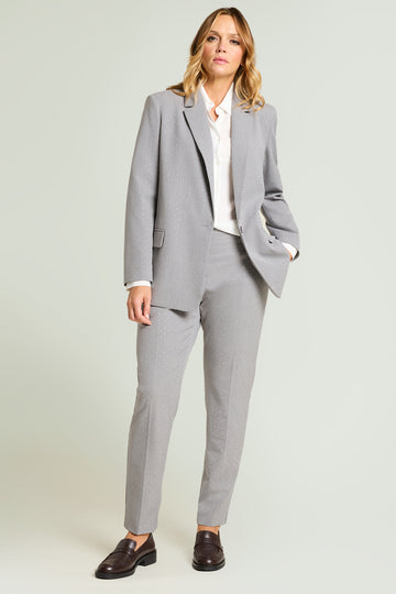 Seguendo le tendenze che uniscono il maschile al femminile, una nuova interpretazione del pantalone grigio melange, espressione di uno stile sofisticato e luminoso, grazie ai punti luce che lo rendono protagonista. Si può indossare anche in coordinato con un blazer nello stesso tessuto.