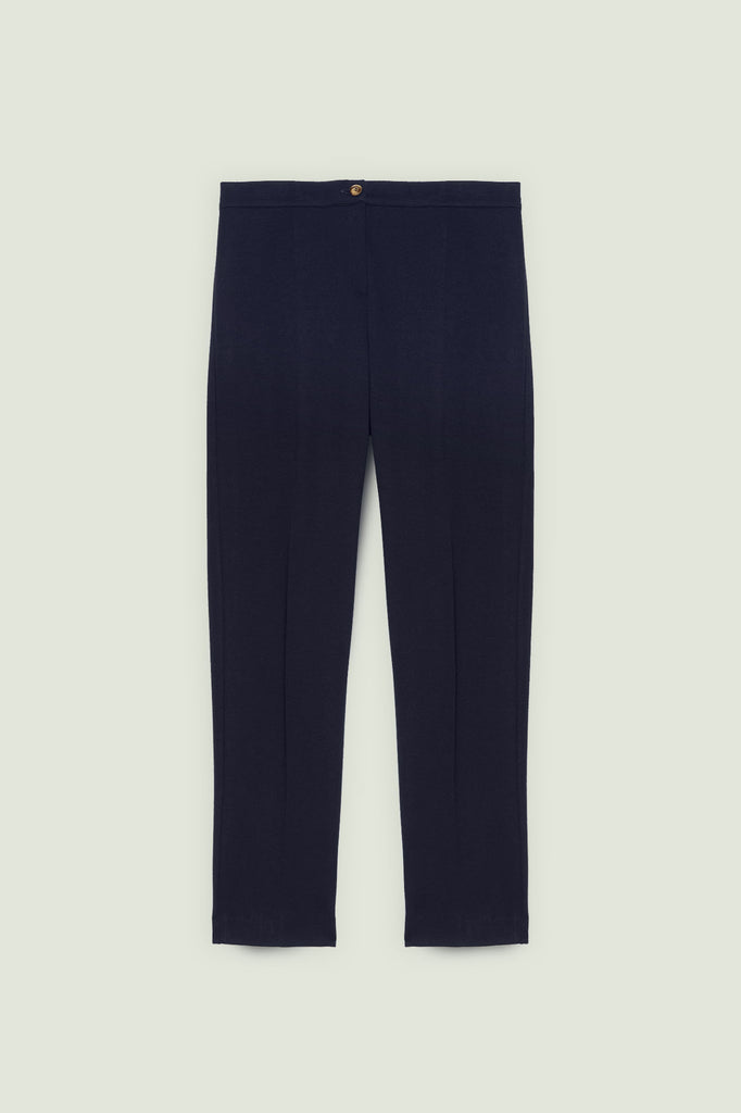 Pantaloni a sigaretta in Punto Stoffa stretch con vestibilità "No-Hips". Punto vita regolare, cinturino con lavorazione estensibile, chiusura davanti con zip nascosta e bottone, piega stirata.