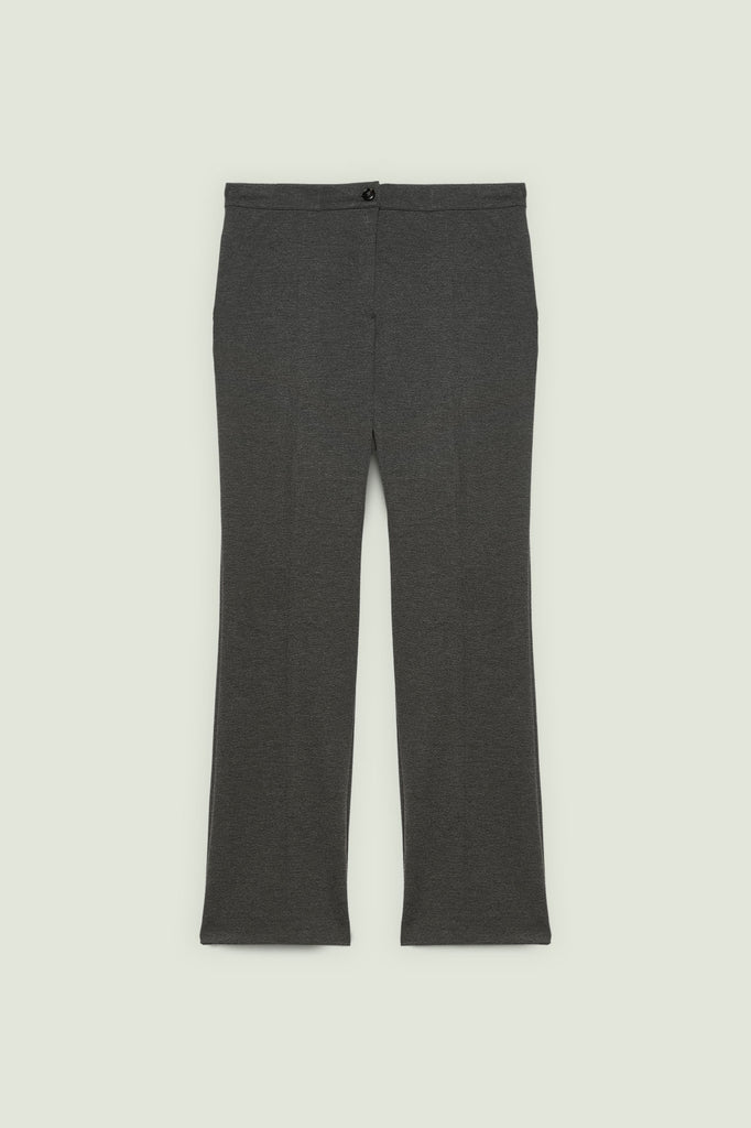 Pantaloni kick flare in Punto Stoffa stretch con vestibilità "No-Hips". Punto vita regolare, cinturino con lavorazione estensibile, chiusura davanti con zip nascosta e bottone, piega stirata.