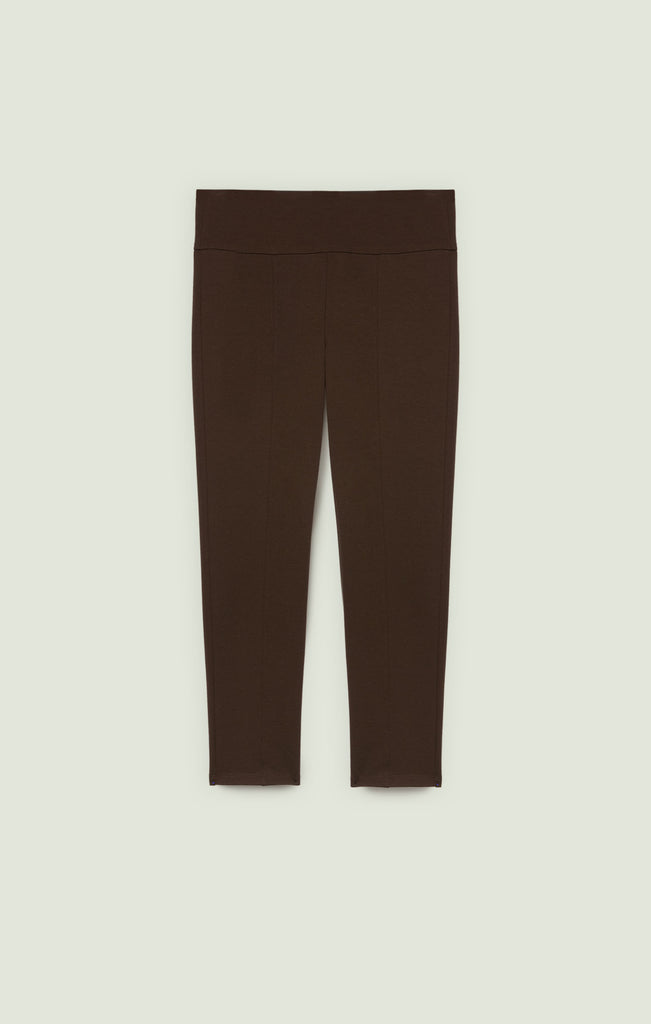 Pantaloni in Punto Milano stretch con fit skinny. Baschina estensibile con gros grain elsatico nel centro dietro, taglio su centro gamba davanti. Costruzione Pull-On.