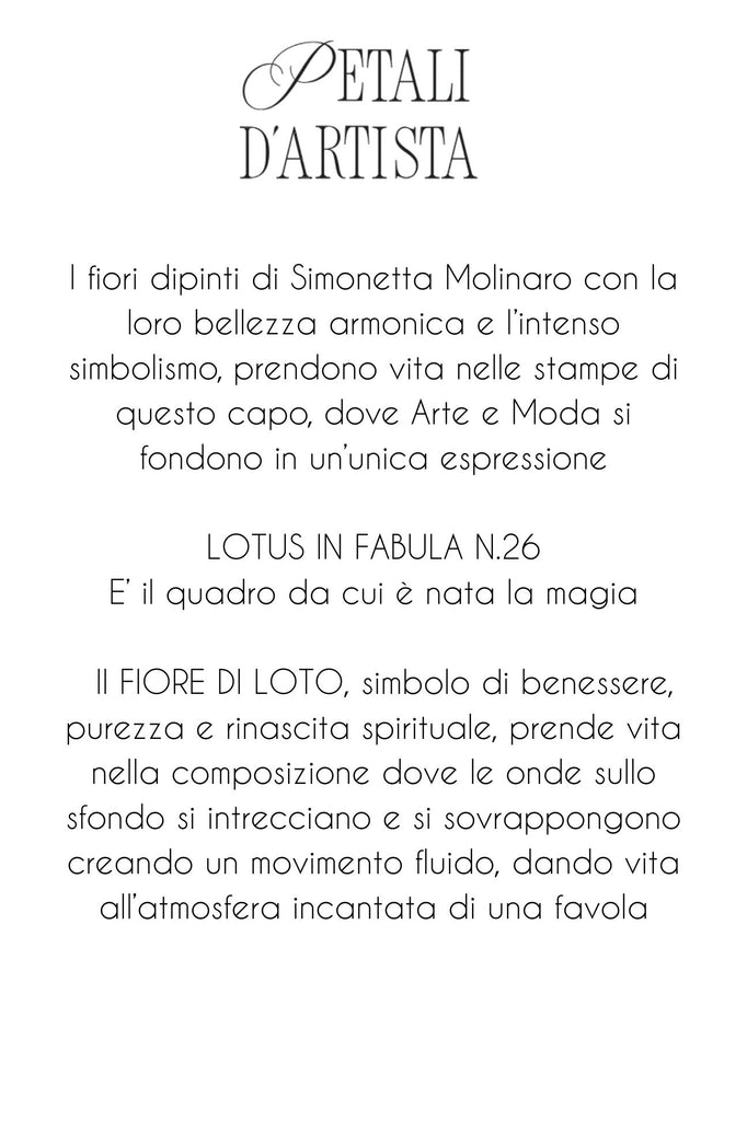 I Fiori dipinti da Simonetta Molinaro, con la loro bellezza armonica e l'intenso simbolismo, prendono vita in questo capo esclusivo dove Arte e Moda si fondono in un'unica espressione.