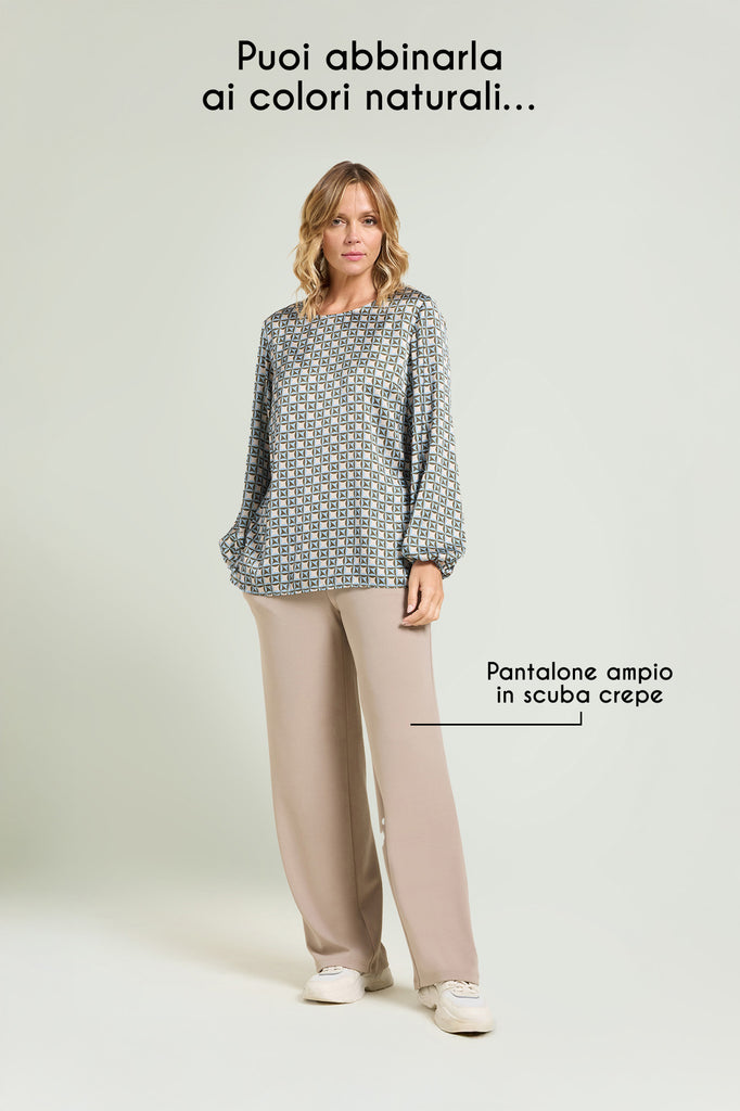 Blusa fantasia in satin stampato. Linea scivolata con spacchi laterali, scollatura a barchetta, maniche lunghe a sbuffo, dietro con carrè doppio e soffietto.