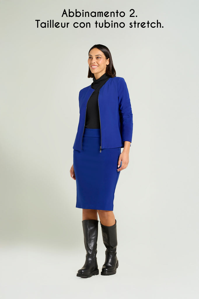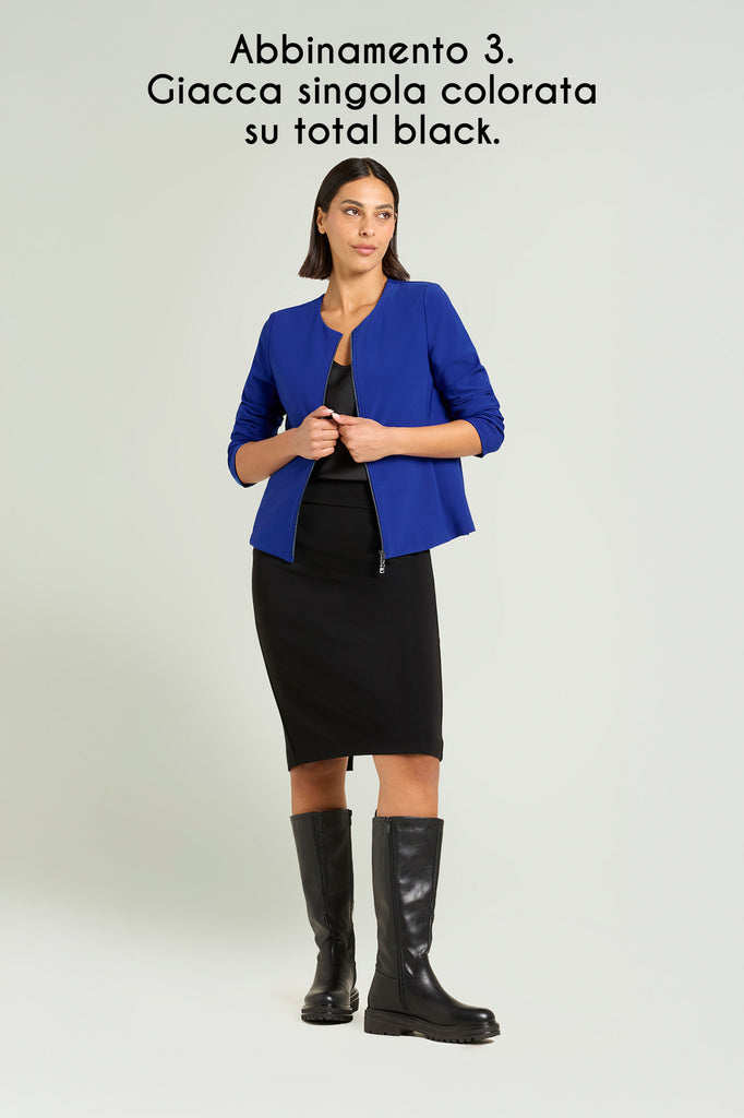 Collarless Jacket realizzata in compatto stretch. Linea leggermente sciancrata, paricollo, chiusura con zip doppio cursore. Tiretti in metallo con finitura gunmetal, personalizzati con il logo "V" di Luisa Viola. Abbinabile anche a completo con pantaloni e gonne nello stesso tessuto.
