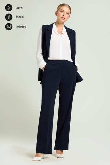 Pantaloni in crepe cady dalla linea ampia. Tessuto stretch four season. Punto vita regolare, chiusura davanti con zip nascosa e bottone, cintura estensibile con elastico inserito nel tratto dietro, tasche all'americana, piega stirata.
