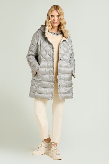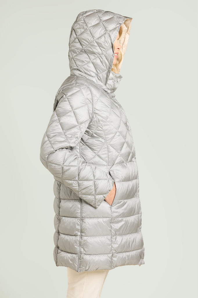 Piumino reversibile in nylon cangiante di lunghezza media, dalla linea leggermente sciancrata. Collo a listino con cappuccio staccabile, chiusura con bottoni foderati in tessuto, tasche a scomparsa chiuse da zip. Imbottitura in fake down.