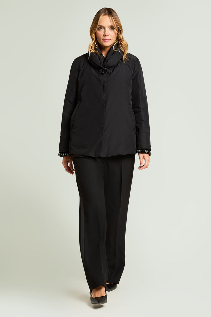 Piumino in nylon memory dalla linea leggermente svasata. Doppio collo a corolla con bottone gioiello, chiusura nascosta con bottoni automatici.