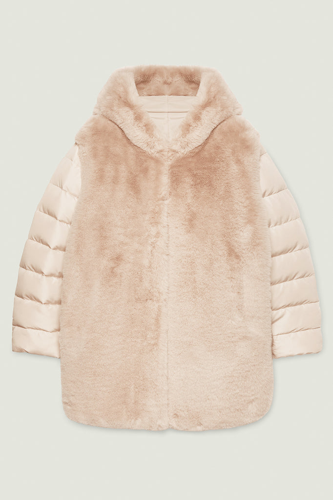 Piumino bimaterico dalla linea leggermente svasata: davanti e cappuccio in tessuto a pelo lungo, maniche e dietro in nylon trapuntato con imbottitura fake down. Chiusura con gancetti, tasche a fessura.