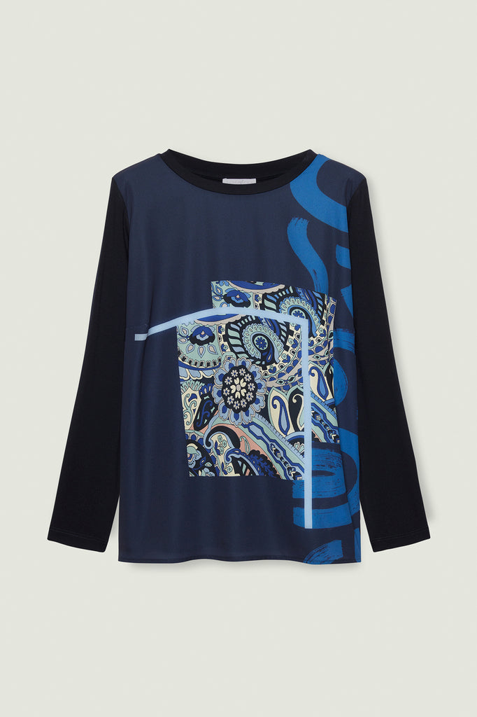 T-shirt in jersey di viscosa stretch con davanti in crepe de chine. Girocollo, manica lunga, fondo stondato. Stampa esclusiva Luisa Viola.