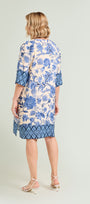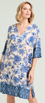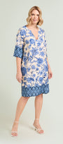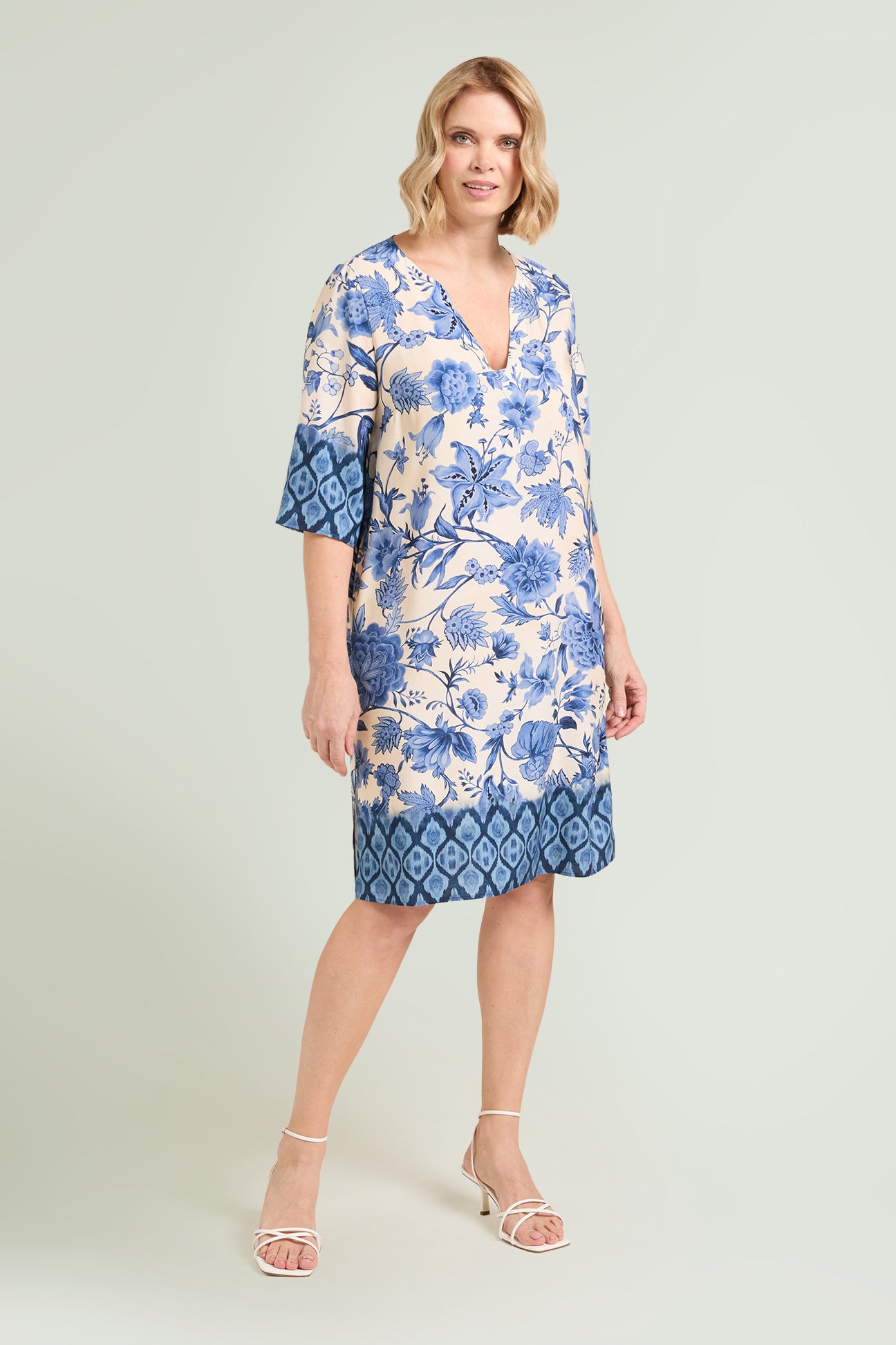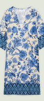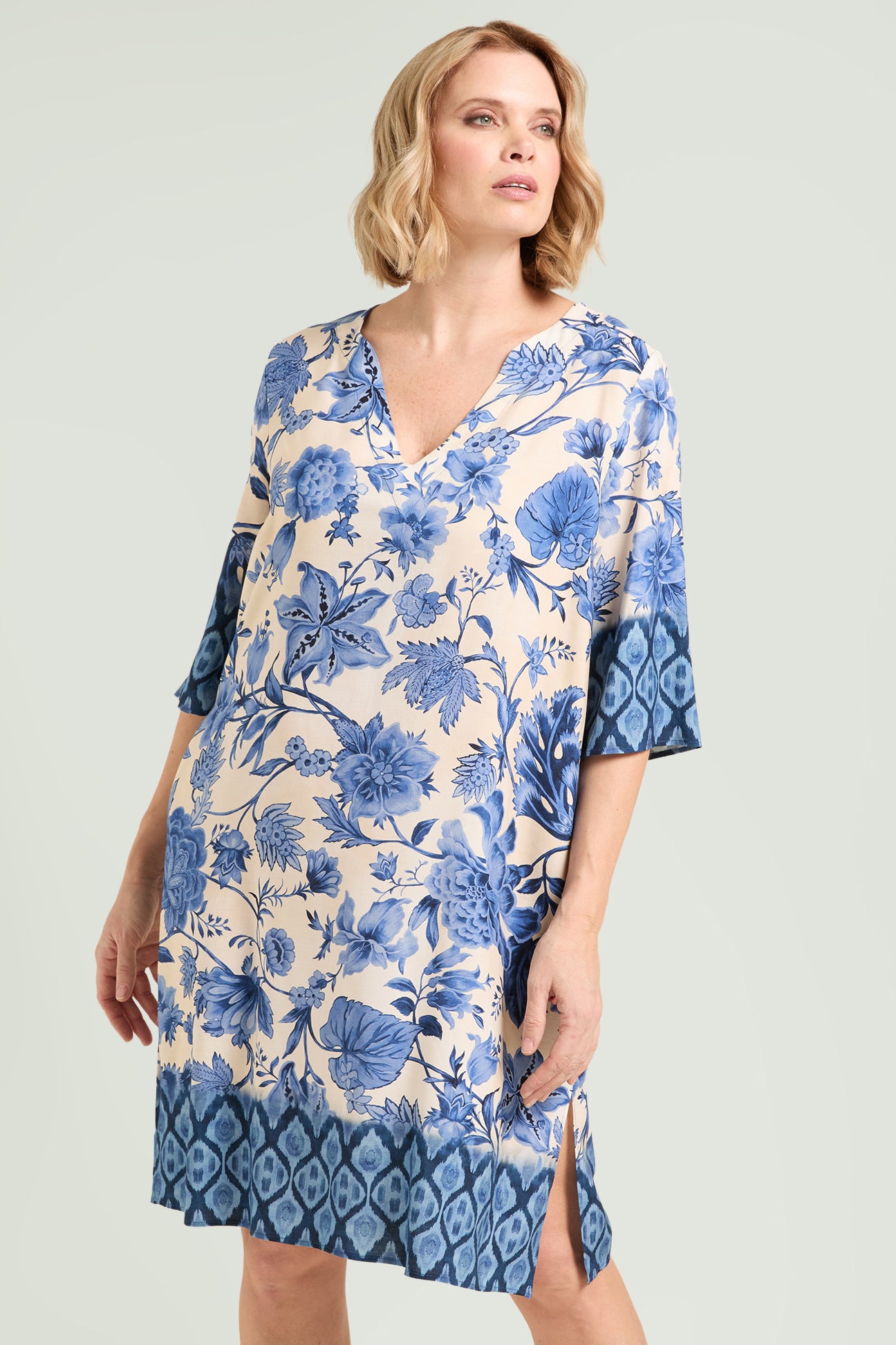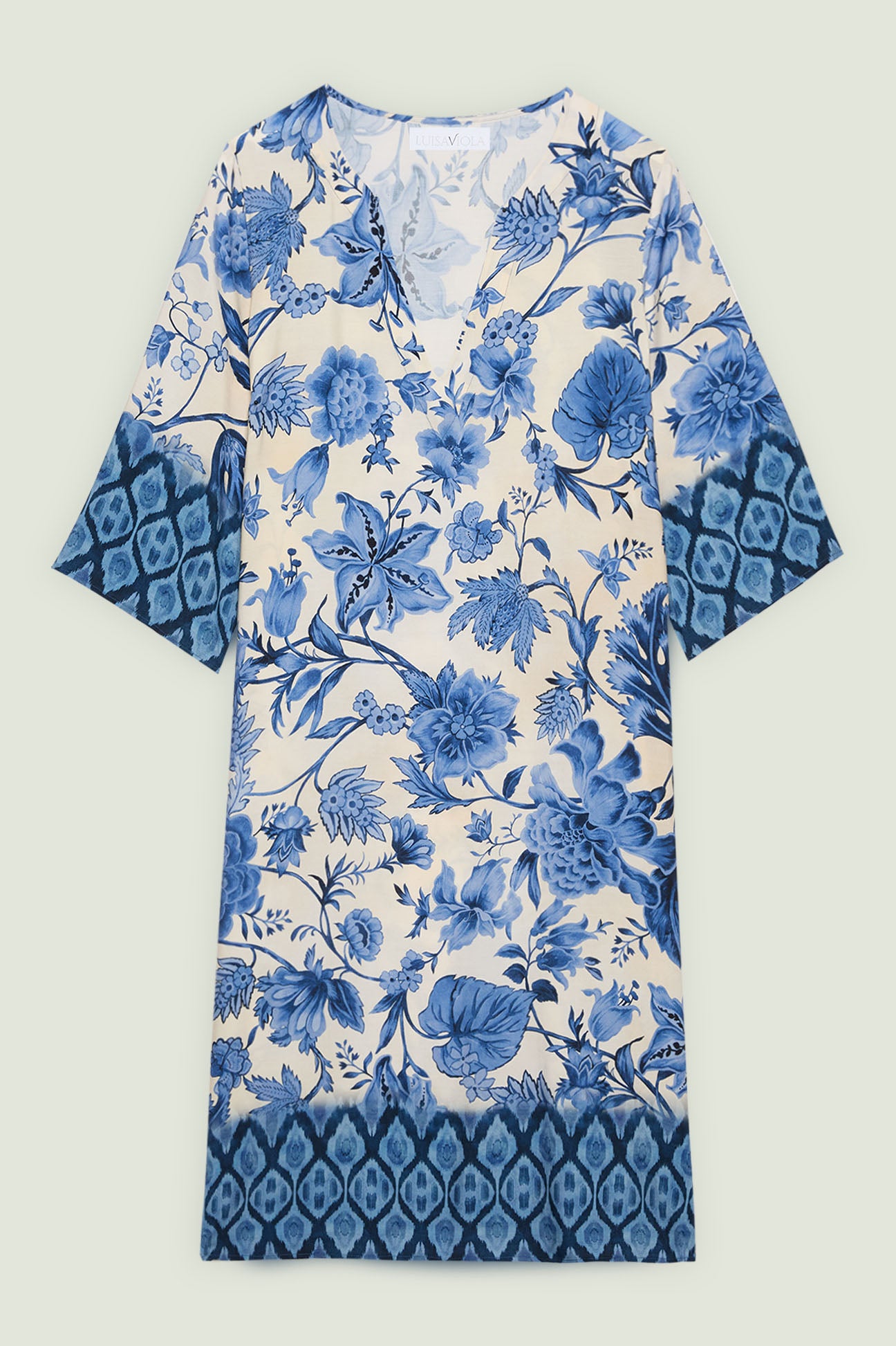 Abito-caftano fantasia in giavanese di viscosa dalla caduta fluida con spacchi laterali. Sollo a V dalla forma sinuosa che valorizza il décolleté, maniche con lunghezza a tre quarti. Tasche a scomparsa inserite nel taglio fianco.
