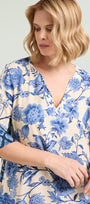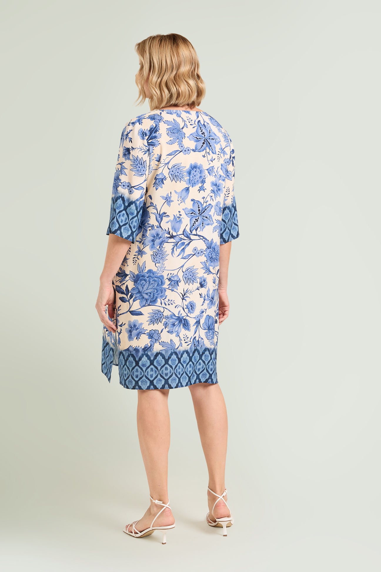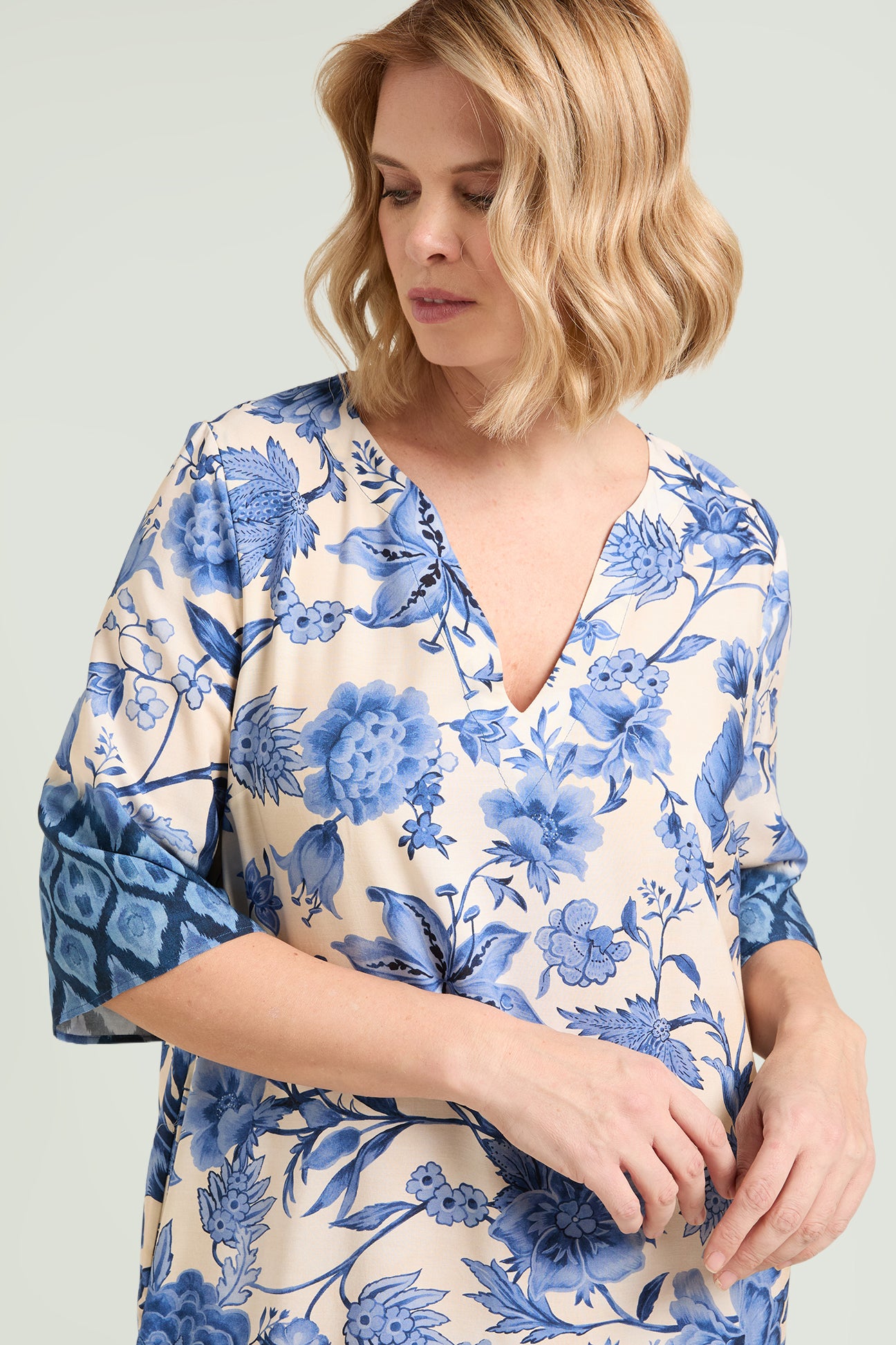 Ramage floreali in sfumature di azzurro e blu si adagiano su fondo avorio, richiamando la delicatezza delle porcellane antiche e i riflessi del mare, arricchiti da bordi batik che raccontano un incontro di culture.