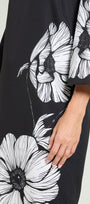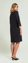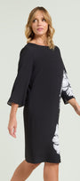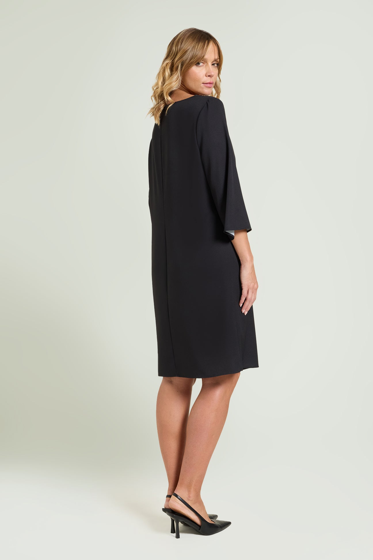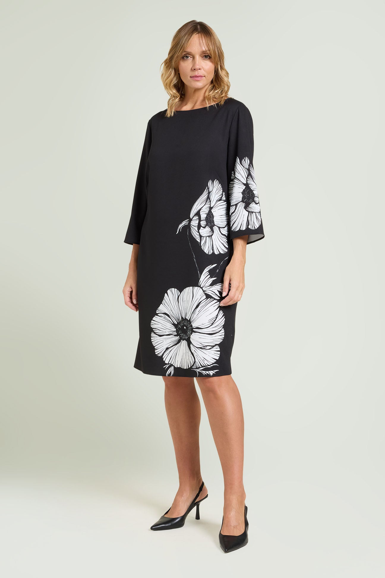 Abito fantasia in tessuto fluido con linea dritta. Scollatura a barchetta, maniche con lunghezza a tre quarti e spacchetto, sfoderato.