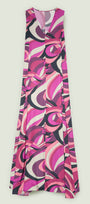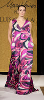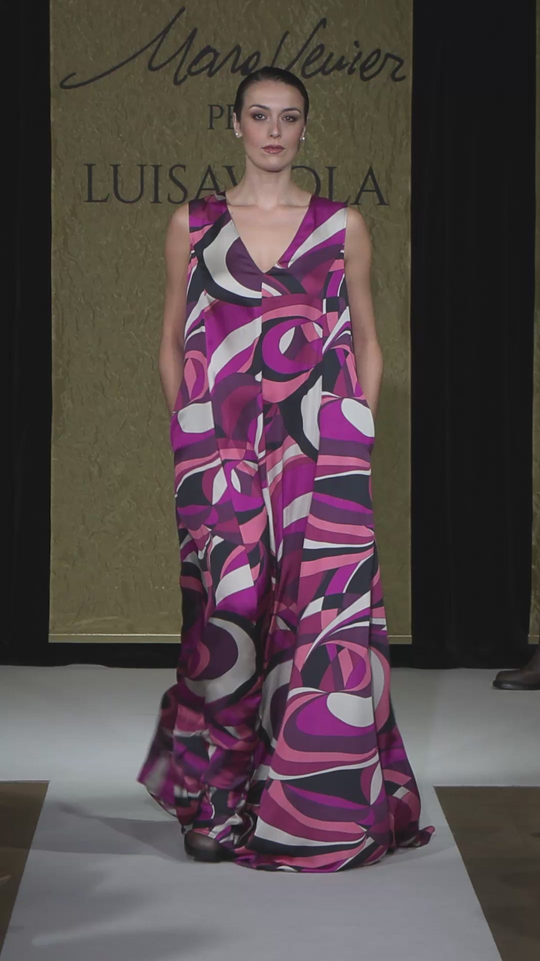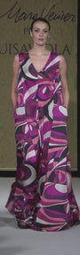 Una stampa che si rifà ai movimenti di avanguardia degli anni 60 legati alle stampe psichedeliche, attraverso le quali veniva rappresentata appieno una certa ricerca di novità visiva e concettuale, soprattutto nel contesto del jet-set della moda di alta classe internazionale. Stampe dove linee sinuose, onde, spirali e curve davano un sensazione di movimento e di cambiamento. In questa reinterpretazione, tocchi di rosa, fucsia, porpora e burgundy sono illuminati da inerventi di bianco e dalla profondità del nero, creando un insieme di grande energia e carattere.