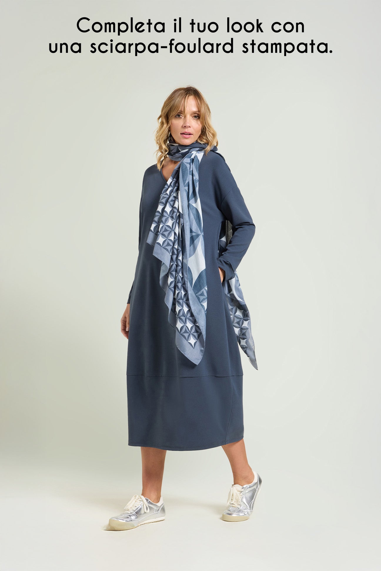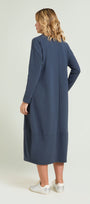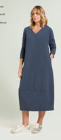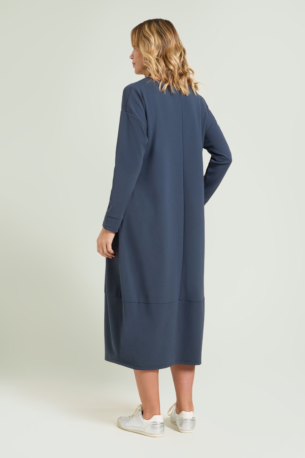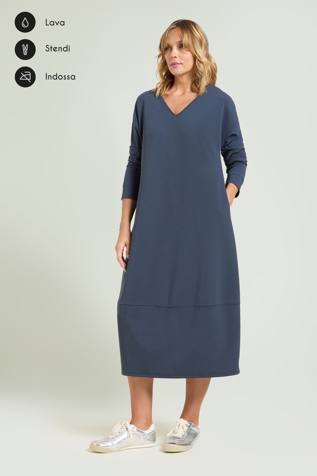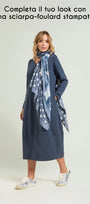 Abito lungo in tessuto super-stretch: uno "scuba crepe" dalla caduta fluida caratterizzato da un rovescio raso che dona una piacevole sensazione sulla pelle. Linea comfort che va a chiudere sul fondo, scollatura a "V", manica lunga, sfoderato.