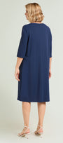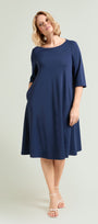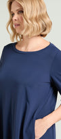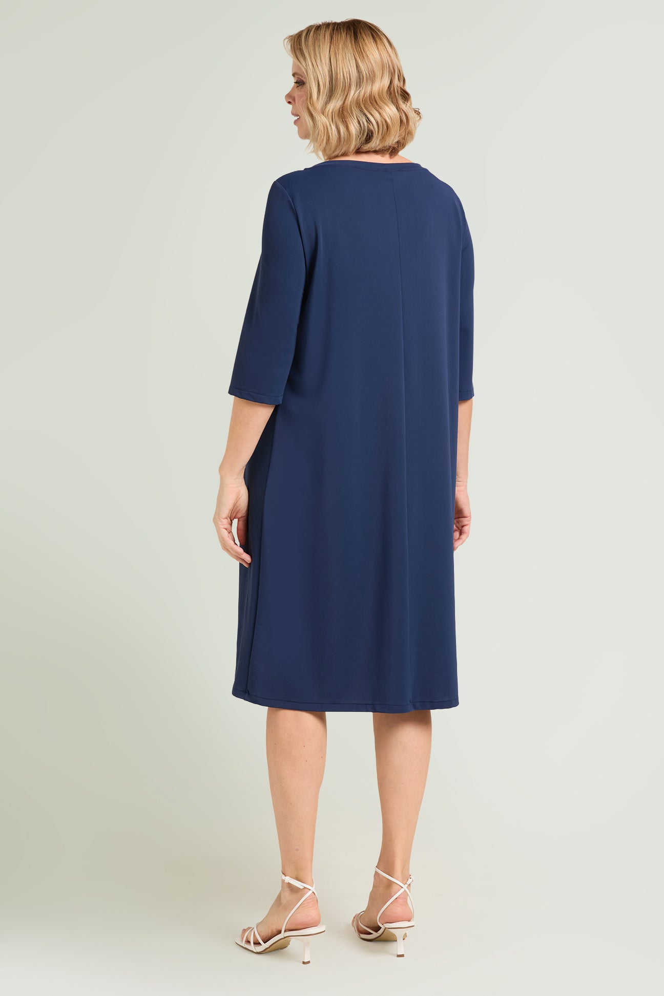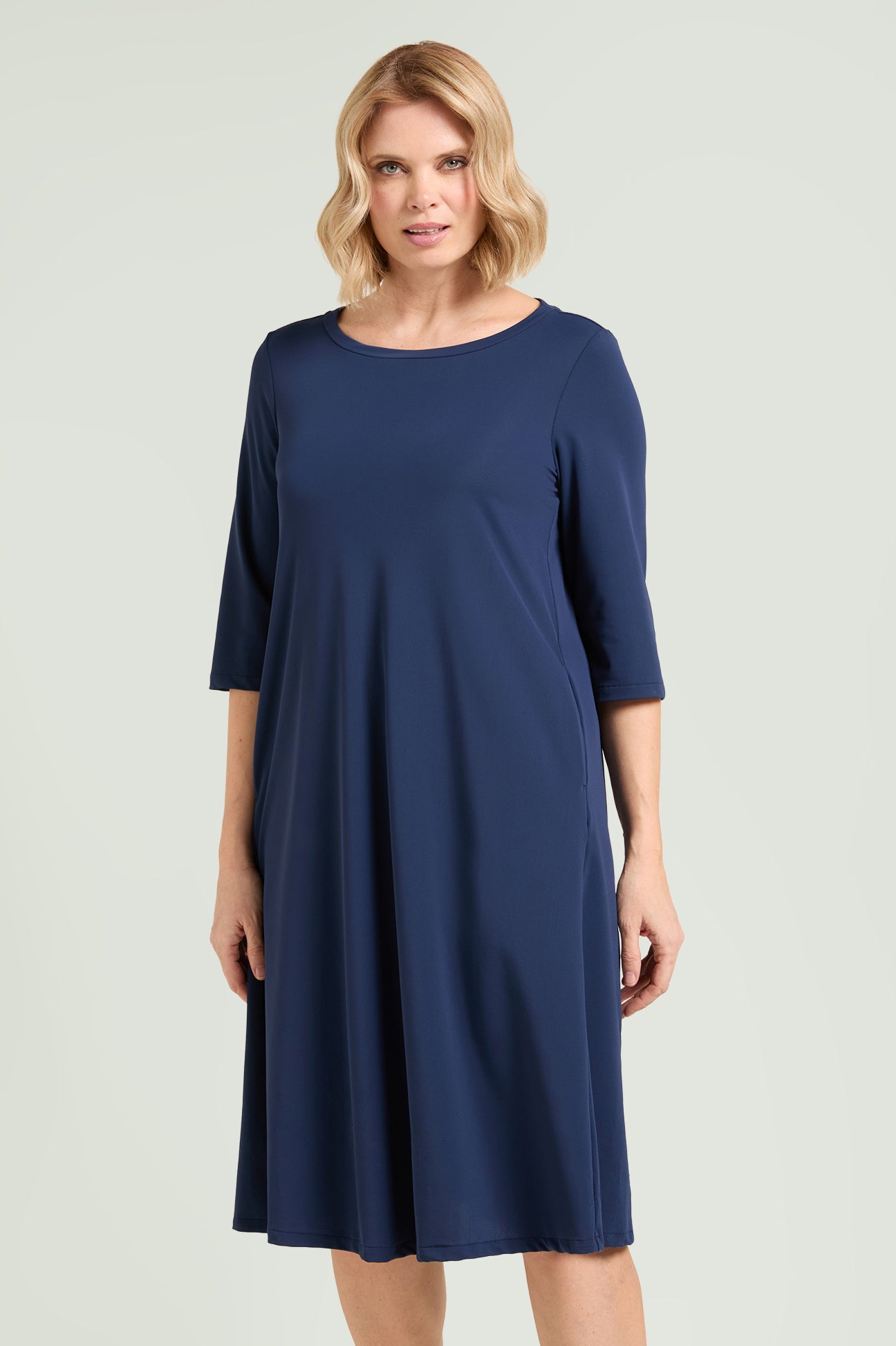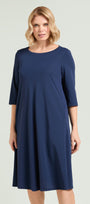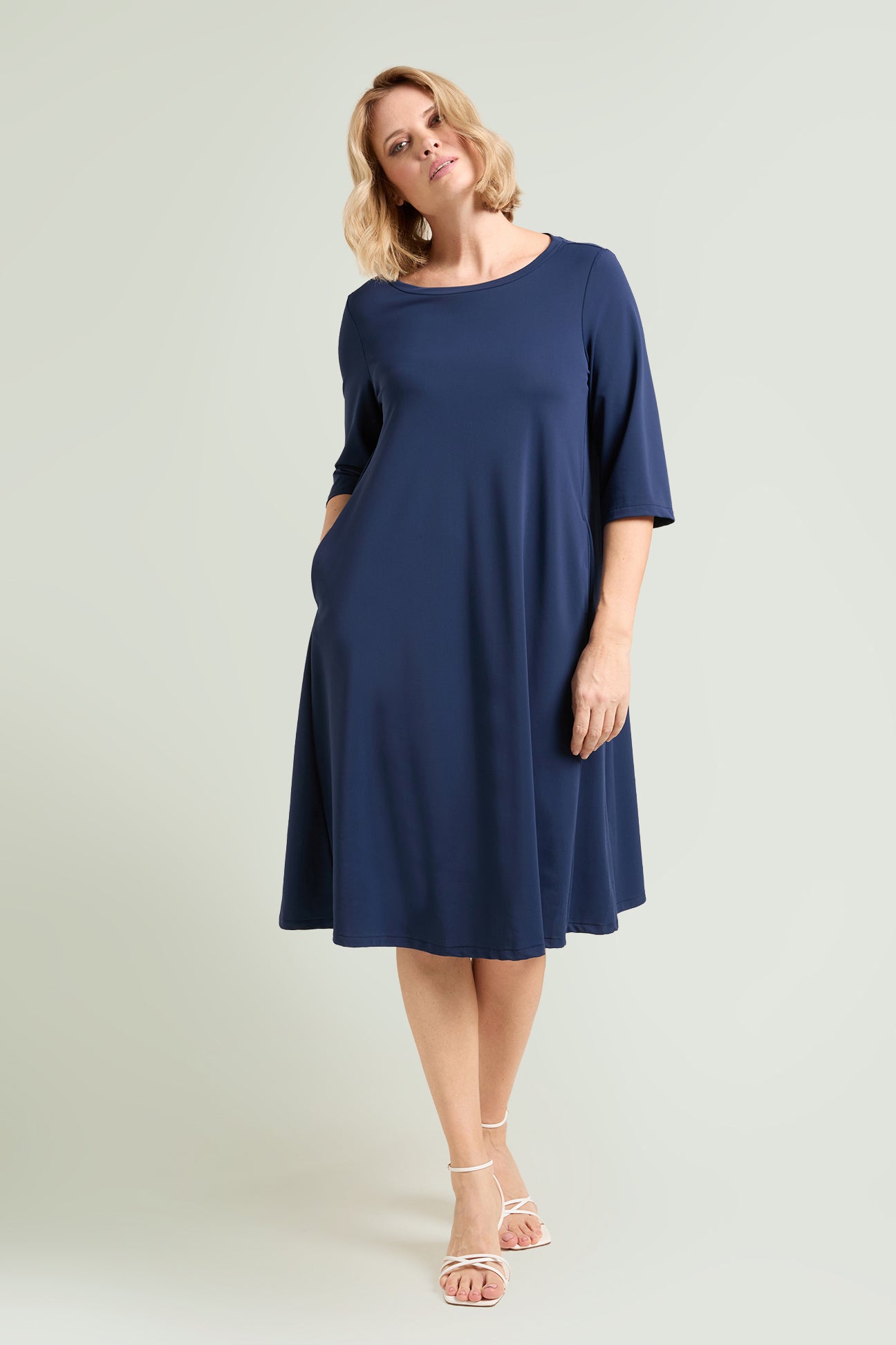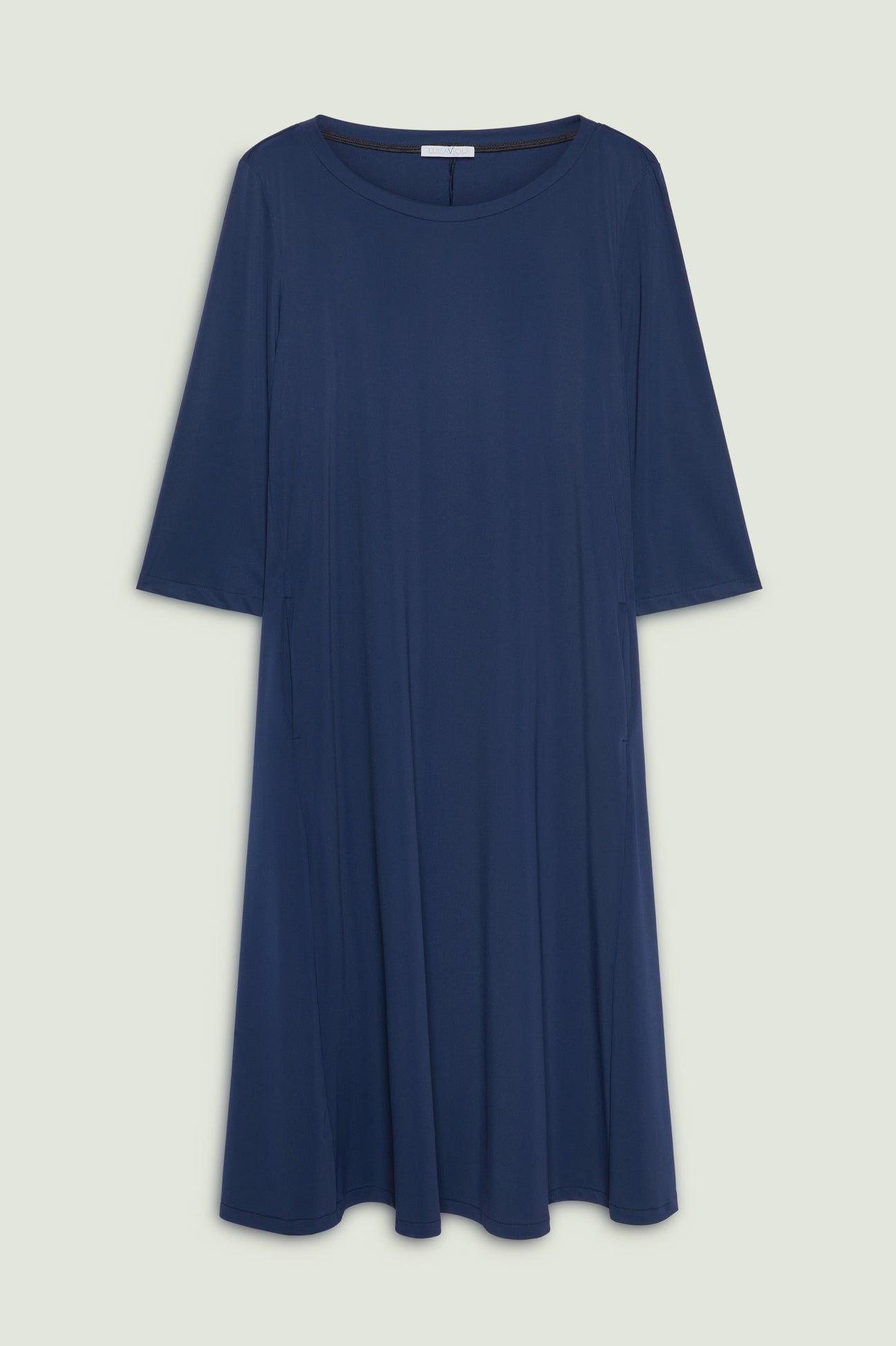 Comodo abito in jersey con armatura piquet dalla linea svasata. Tessuto elasticizzato. Scollo rotondo, manica con lunghezza a tre quarti, tasche a scomparsa.