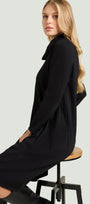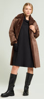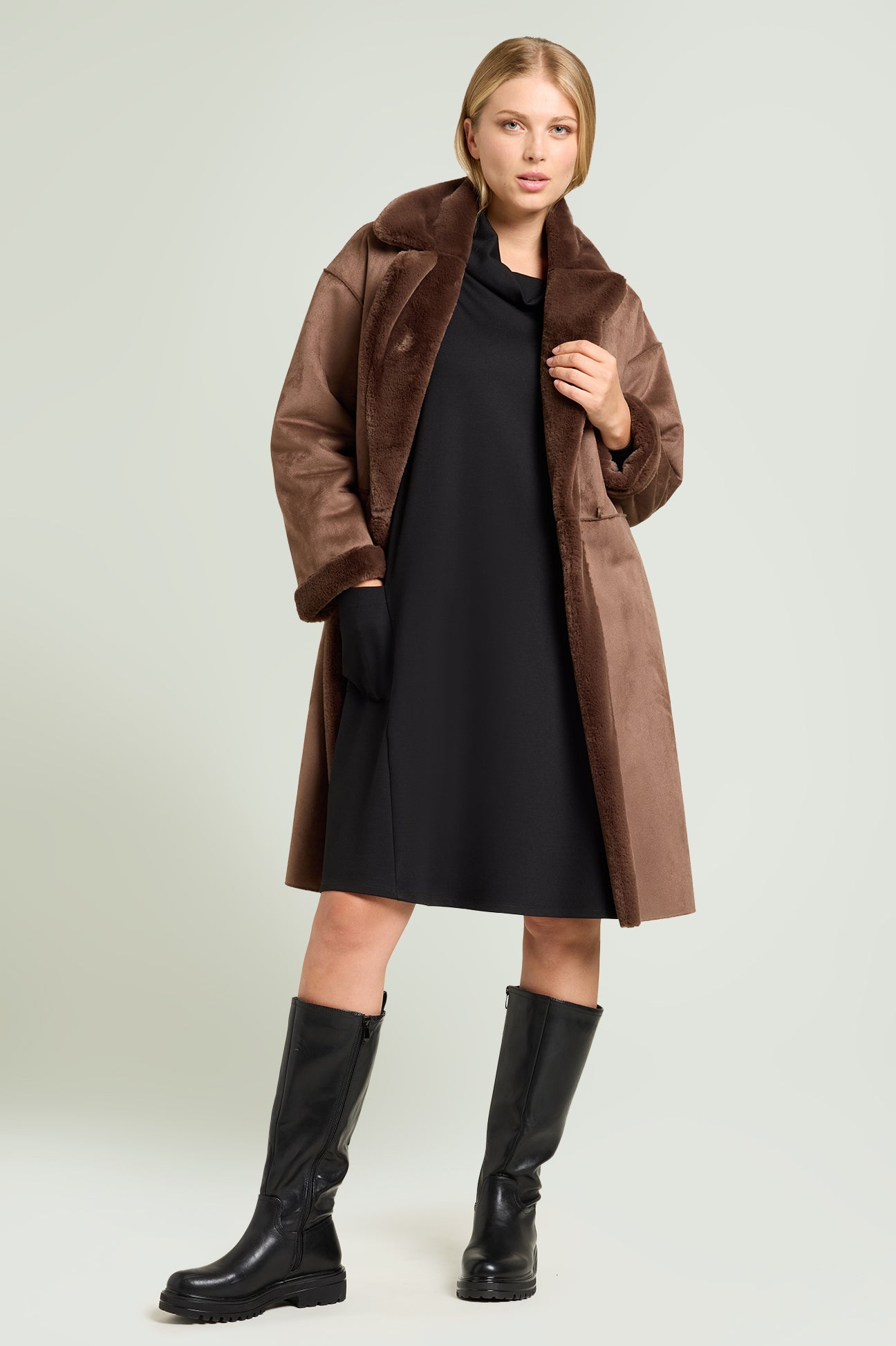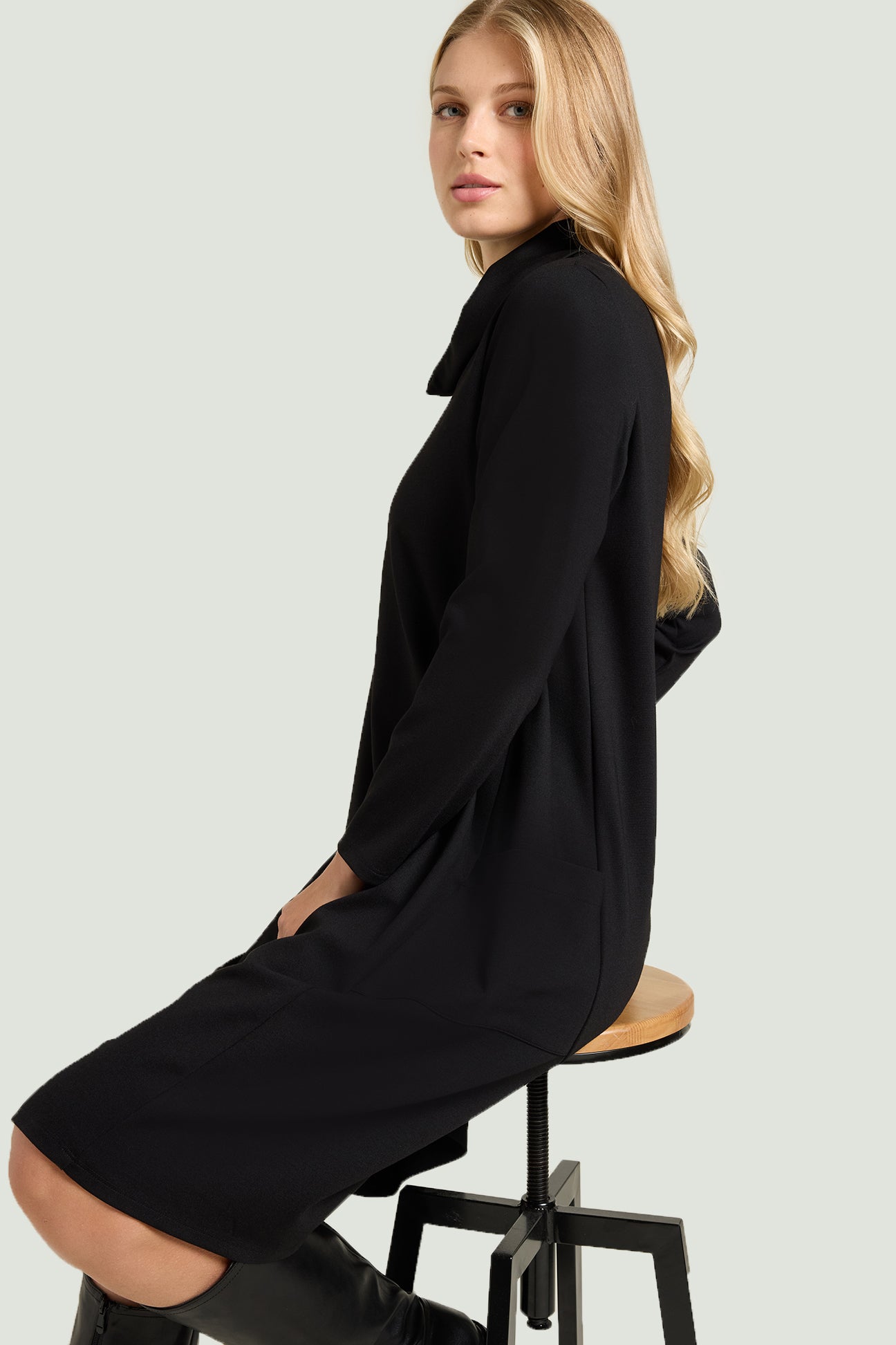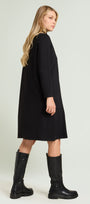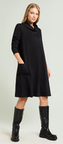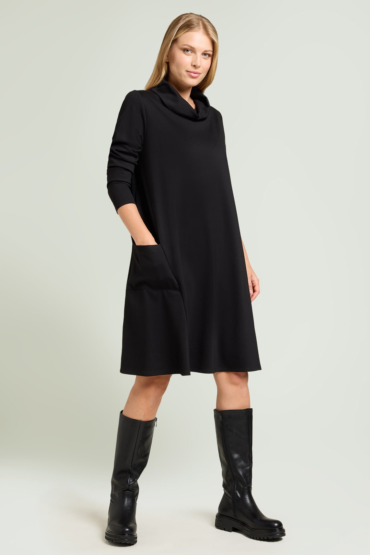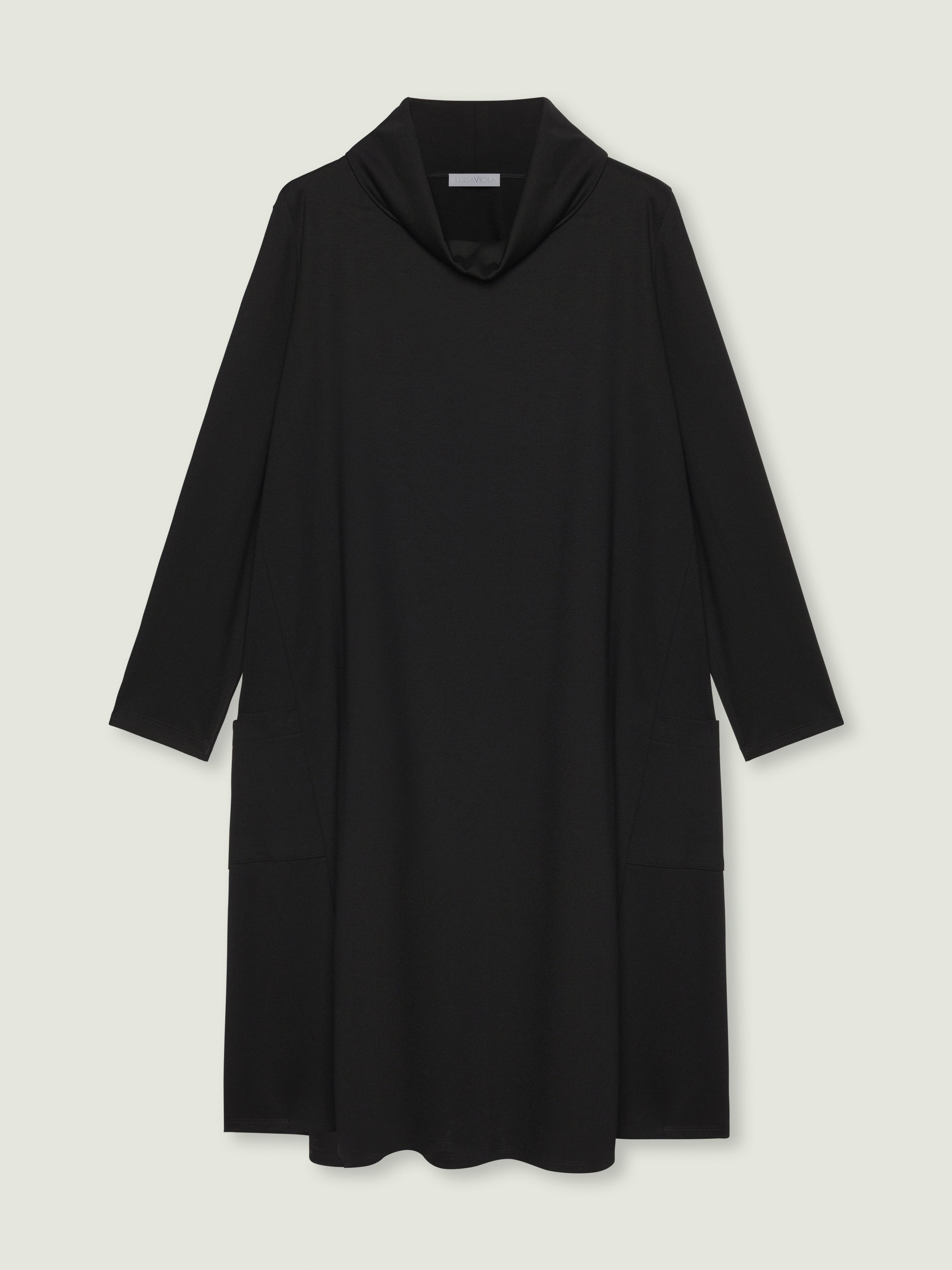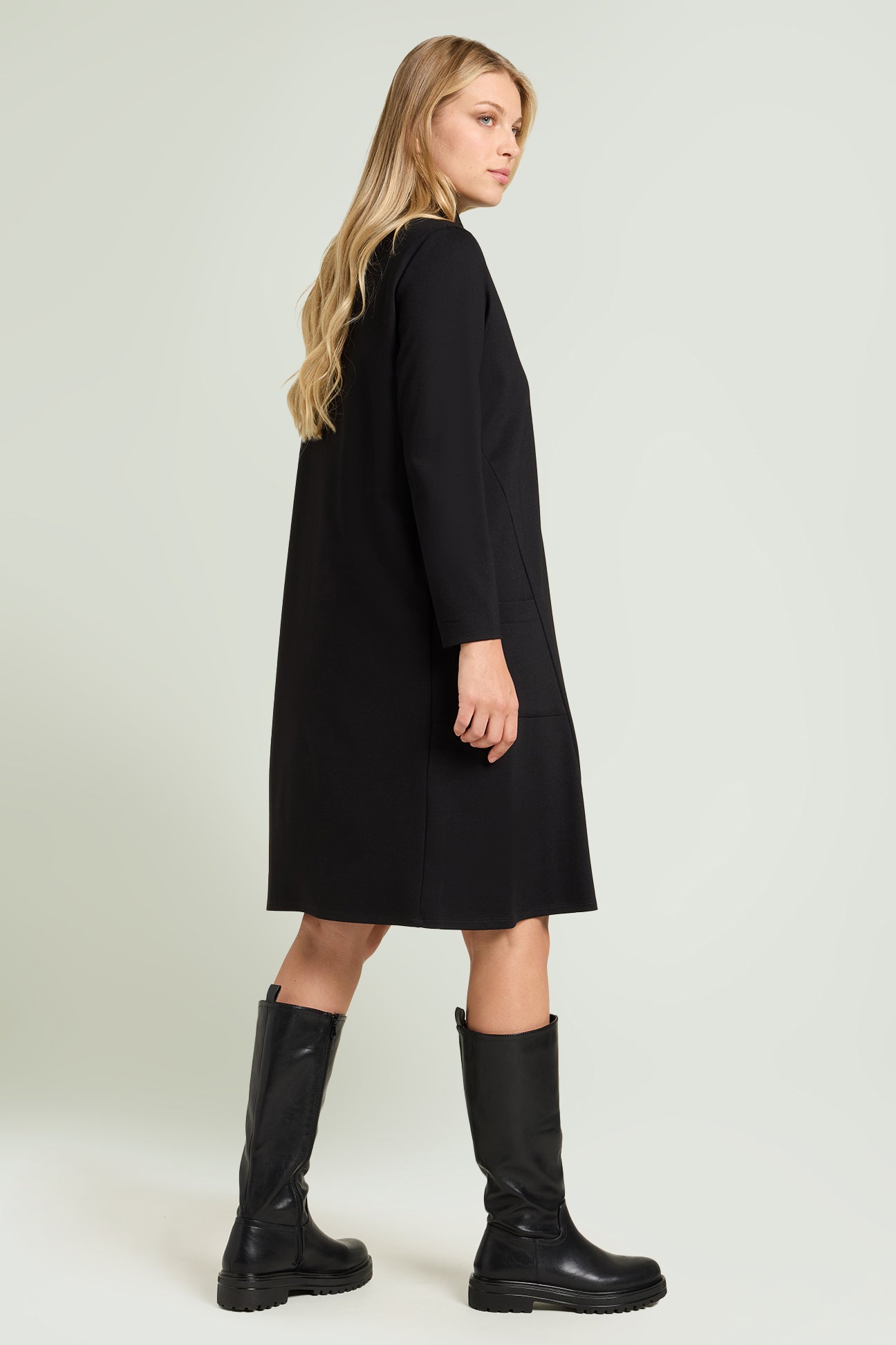 Abito in Punto Milano stretch dalla linea svasata. Collo ad anello, tasche applicate, sfoderato.
