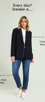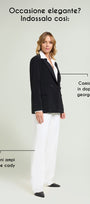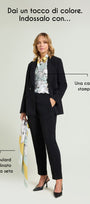 Blazer doppio petto in cady crepe dalla linea leggermente affiancata. Tessuto stretch four season. Collo e rever, pattine, foderata. Abbinabile a pantaloni nello stesso tessuto per creare un tailleur coordinato.