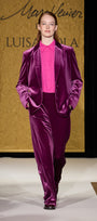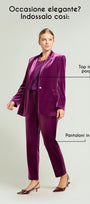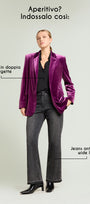 Come insegna la tradizione sartoriale, il capo è tagliato con la direzione del velluto rivolta verso l'alto, in modo da ottenere un effetto uniforme del tessuto, un colore più intenso e un aspetto prezioso. Disponibile in nero e in due colori moda: porpora e blu pavone.
