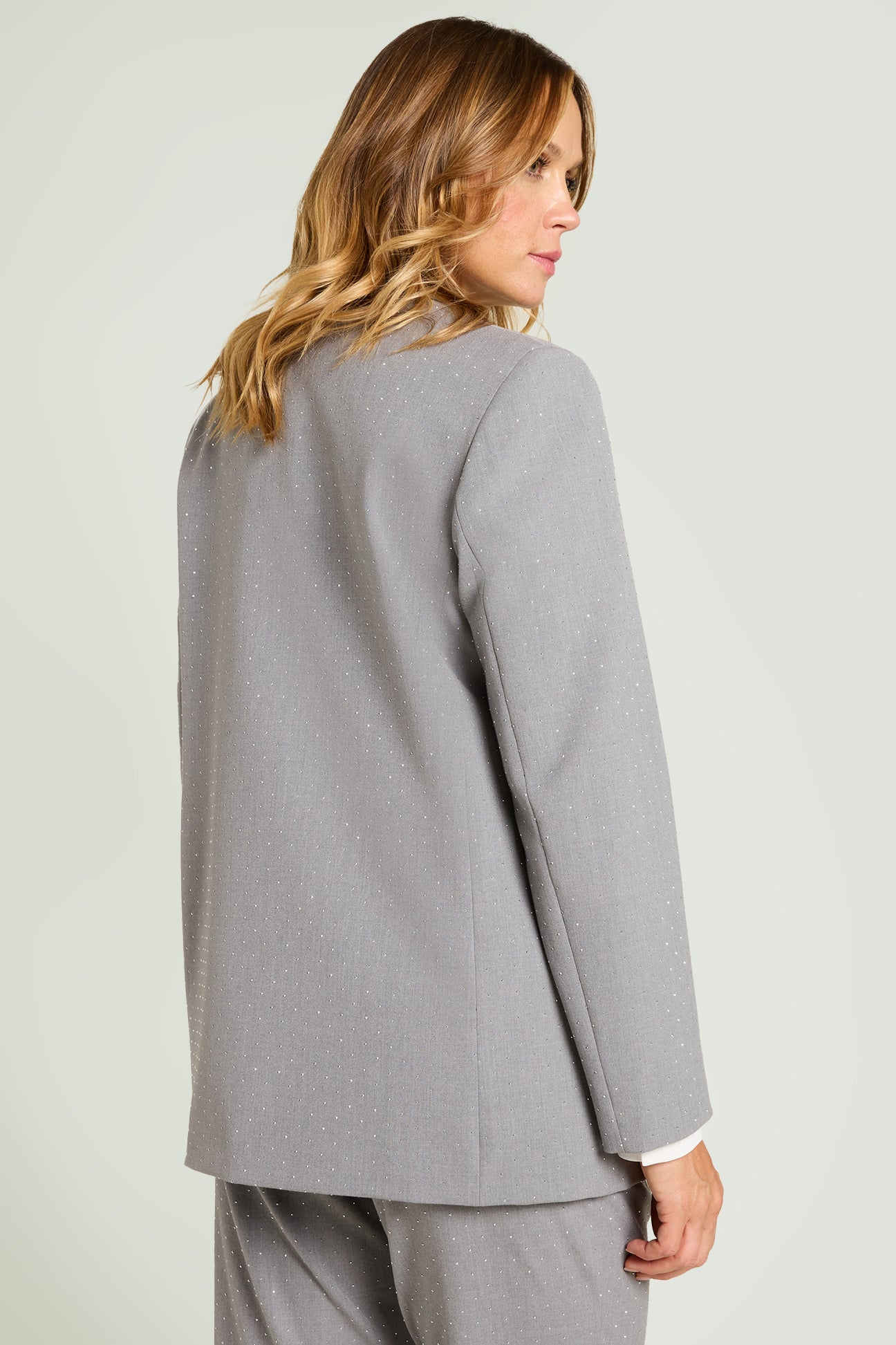 Blazer monopetto in tessuto melange elasticizzato caratterizzato da una pioggia di micro borchiette sfaccettate. Collo e rever, chiusura con asola e bottone, pattine, foderato.