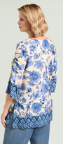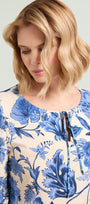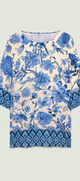 Ramage floreali in sfumature di azzurro e blu si adagiano su fondo avorio, richiamando la delicatezza delle porcellane antiche e i riflessi del mare, arricchiti da bordi batik che raccontano un incontro di culture.