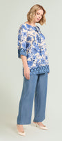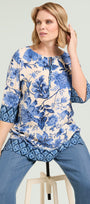 Blusa-caftano fantasia in giavanese di viscosa dalla caduta fluida con spacchi laterali. Sollo ad "Y" con laccetti, maniche con lunghezza a tre quarti.
