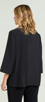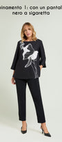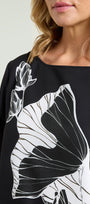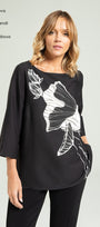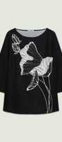 Blusa fantasia in tessuto fluido con linea leggermente svasata e spacchi laterali. Scollo a barchetta, maniche con lunghezza a tre quarti.