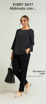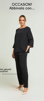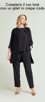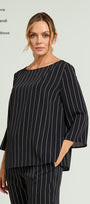 Blusa fantasia in cady gessato dalla linea dritta con spacchi laterali. Scollo a barchetta, maniche con lunghezza a tre quarti con spacchetto interno.