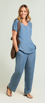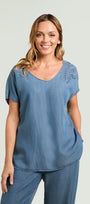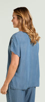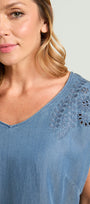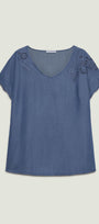 Blusa in chambray con trattamento stone washed caratterizzata da un ricamo traforato in filo. Taglio chimono, manica corta, spacchetti laterali. Facilmente abbinabile, si può anche indossare a completo con capi realizzati nello stesso tessuto.