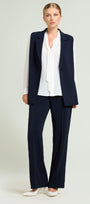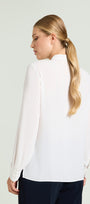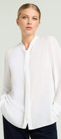 Camicia in doppia georgette dalla linea dritta con spacchi laterali. Chiusura nascosta con bottoni, sciarpina portabile in diversi modi, manica lunga con polso.