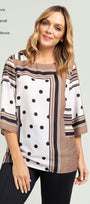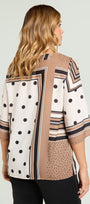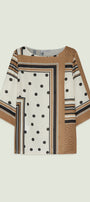 Blusa fantasia in doppia georgette stampata dalla linea dritta con spacchi laterali. Scollo a barchetta, Maniche con lunghezza a tre quarti.