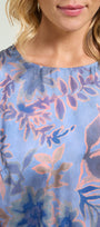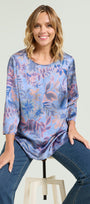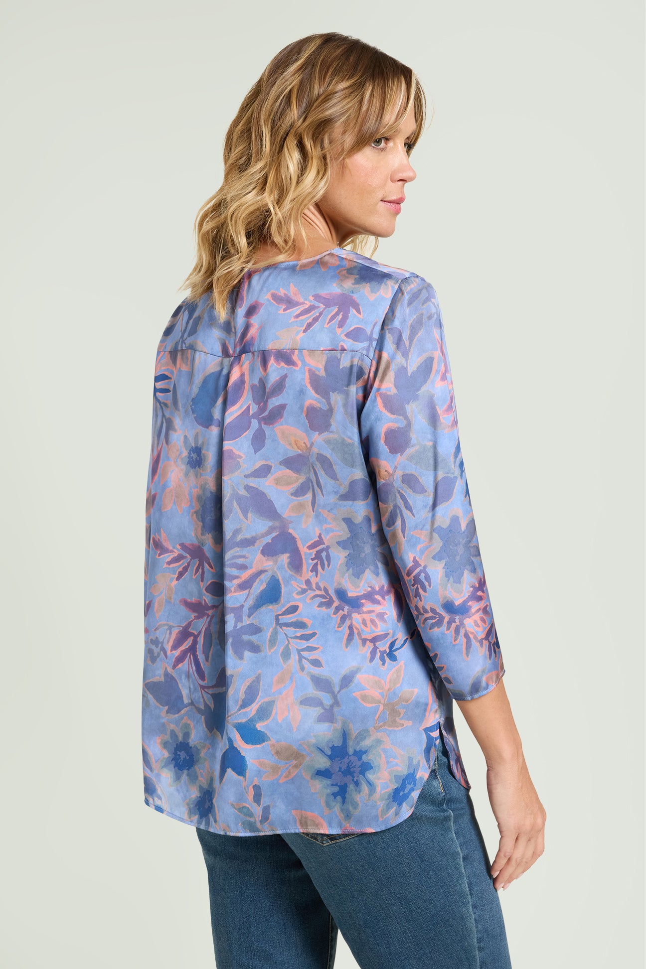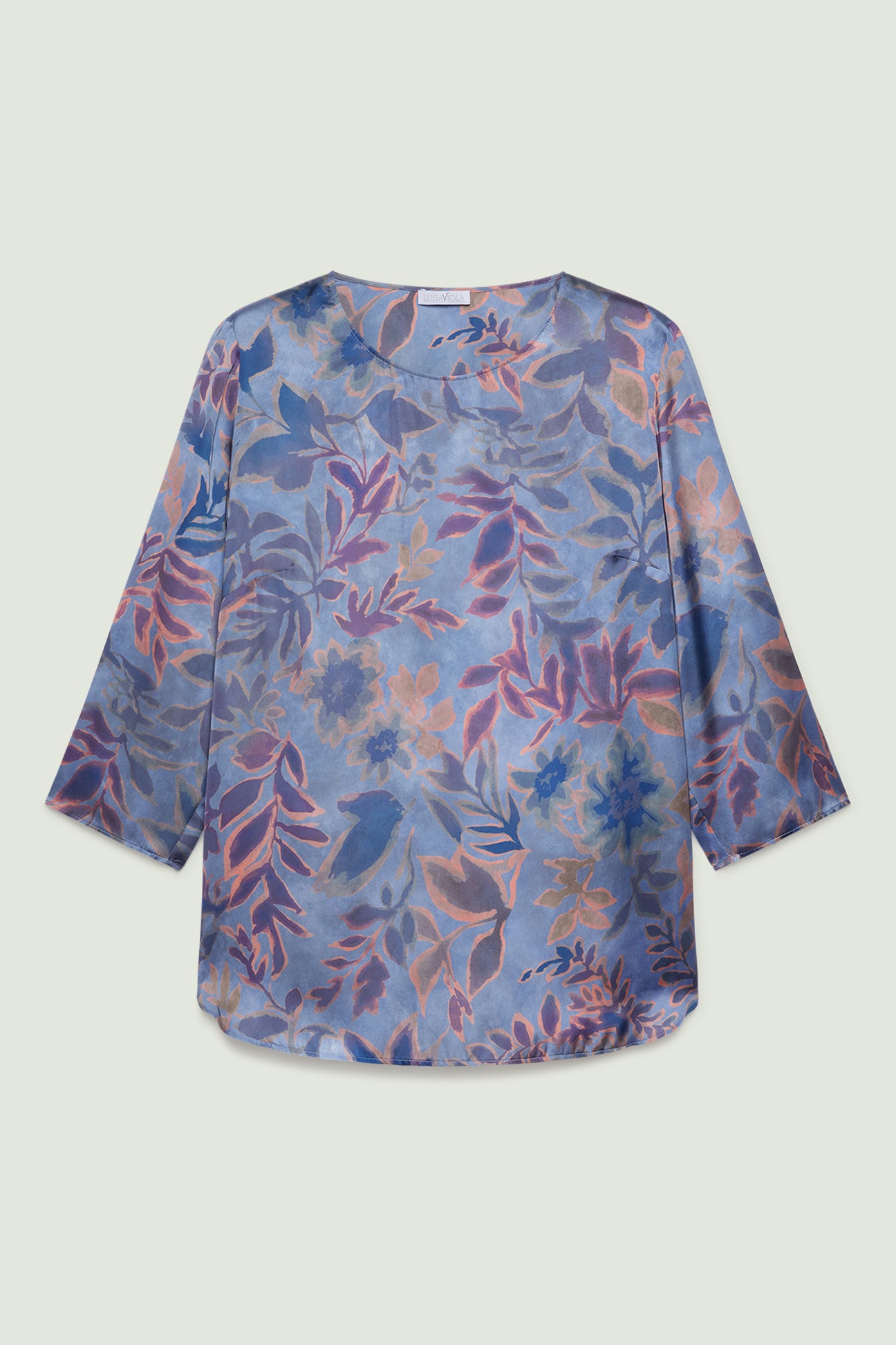 Blusa fantasia in satin stampato. Linea dritta con spacchi laterali stondati, scollatura a barchetta, maniche con lunghezza a tre quarti, dietro con carrè doppio e soffietto.