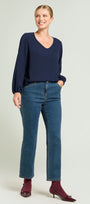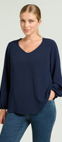 Blusa in cloque' caratterizzata da un femminile scollo a "V", linea dritta con spacchetti stondati, manche a sbuffo.