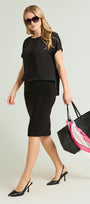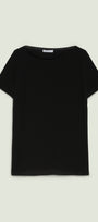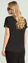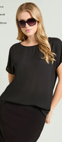 Blusa femminile in doppia georgette, con scollo a "V" e volant. Tessuto doppio su davanti e dietro con effetto di sovrapposizione sul fondo. Manica corta.